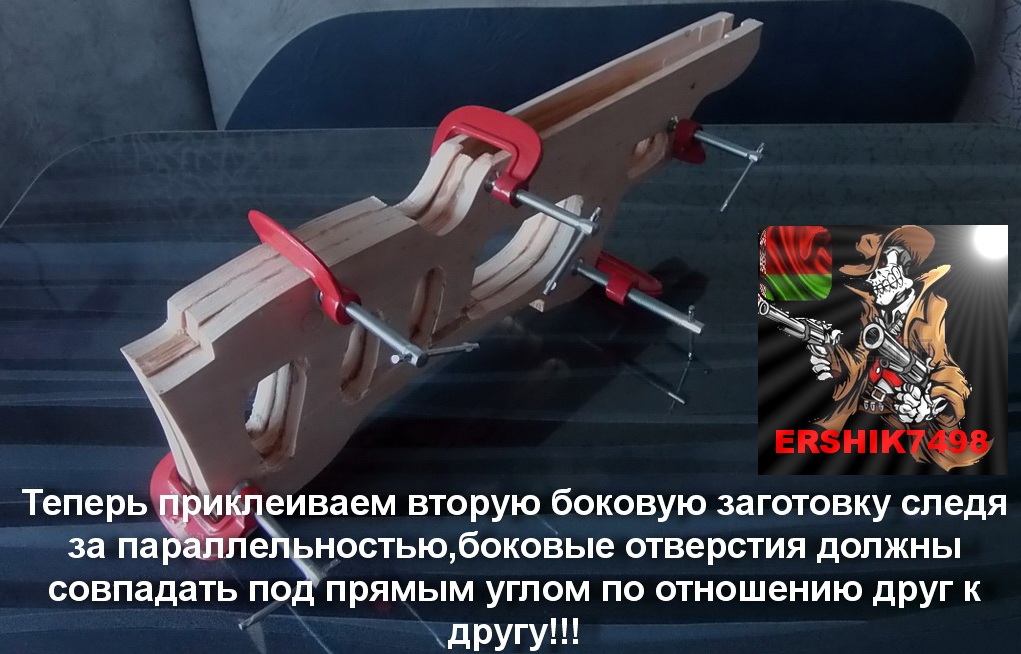 Дайте высохнуть склеенным заготовкам как рекомендуют не меньше суток.Затем снимите струбцины,и повторите процесс с приклеиванием второй боковины ложи.К слову,если Вы уверены в себе,можно склеить сразу все заготовки ложи,я клеил поочерёдно каждую чтобы иметь возможность проследить точно за смещениями заготовок а в частности полочек под «железо».Сушим также наше творение не менее суток!Вот: