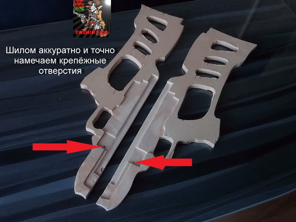 После вырезания трафарета средней заготовки у вас останется трафарет «железа».Аккуратно и точно по месту приложите его с внутренней стороны боковых заготовок и переведите,отметьте места под крепёжные винты как можно точнее.Это последний подготовительный шаг перед изготовлением ложи!