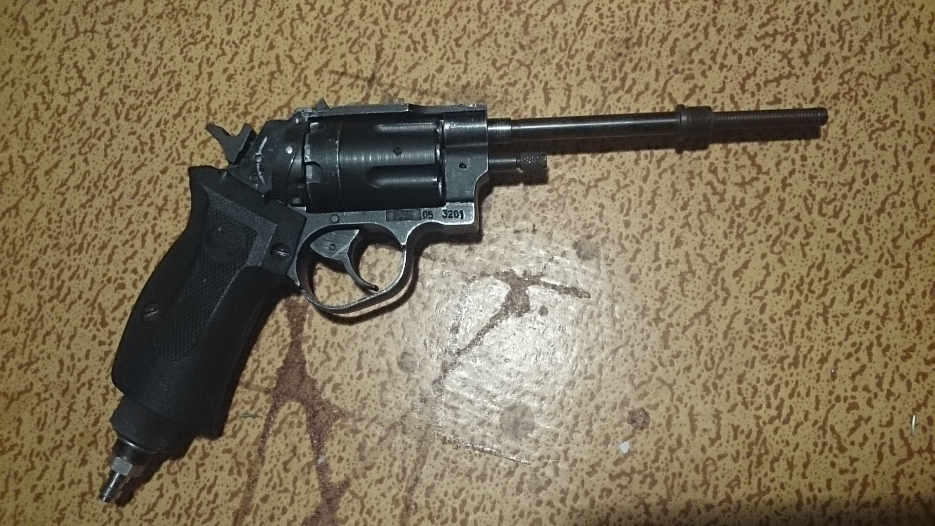 Собственно РПШ, барабан перепилен в цельновращающийся длиной 50 мм (привет дротикам), пробка родная плюс пробка с квиком для заправки от огнетушителя либо воздухом. Дул 150 атм.
