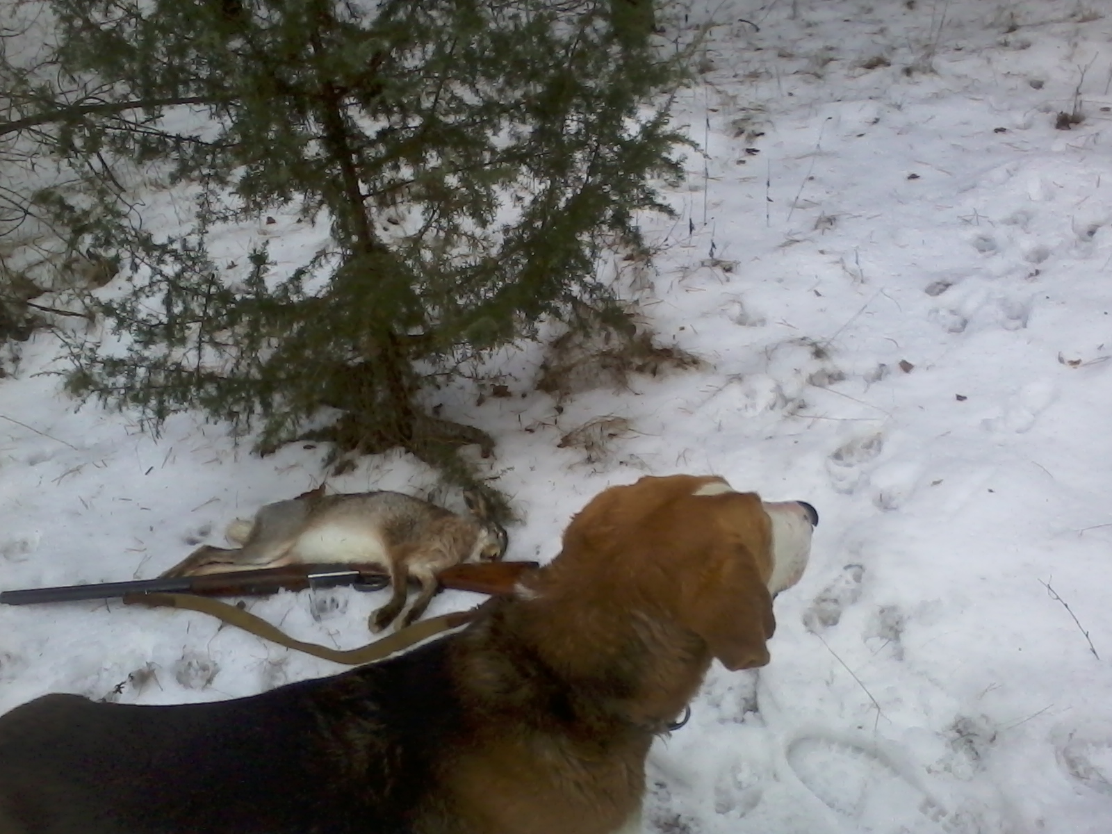 Заяц, на удивление, делал очень малые полукруги и круги, топтался по кустам, забегал часто в лес. Так, прыгая туда-сюда, через минут 25-30 был ушастый уложен с единички. Ох, как я гладил и хвалил выжлеца, и все бублики с рюкзака скормил ему, как-бы в знак извинения. В 11-34 я был уже дома.