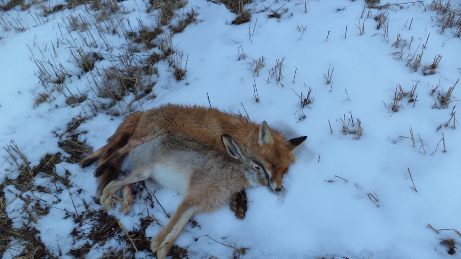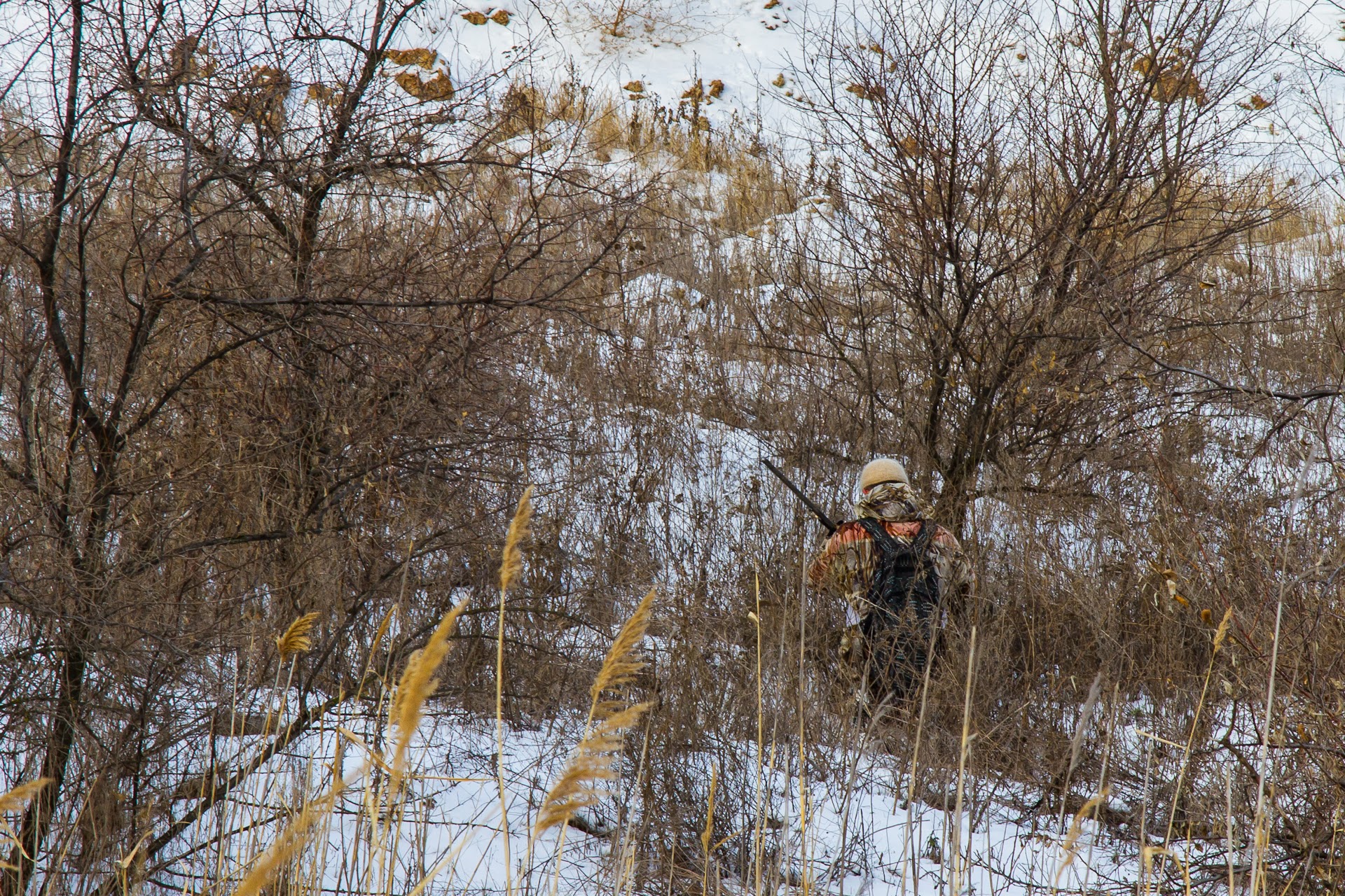 С рассветом отправился. Сильнейший ветер. На поле слабый наст. Захожу в посадку - следа нет. Дальше иду вдоль заросшего кустарника. Слышу, работает выжлец. Ага, значит походил косой. Стал на краю между кустами и лесом на заросшей дороге. Минут 15 стою - нет гона. Выжлец вышел на поле, ...гав, гав, гав, опять в кусты.