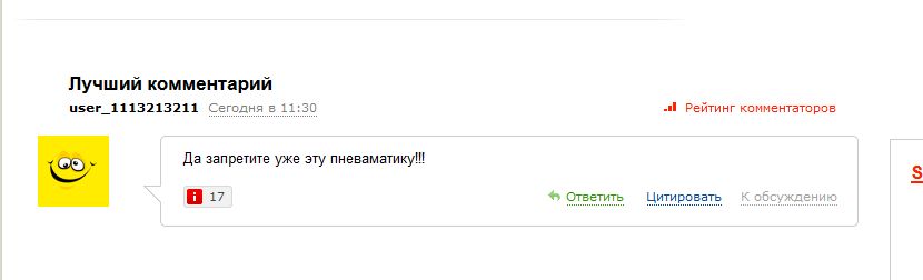 Пневмокультуру прививать нужно, а не ограничивать. Но, с*ка, за шараплюи ипать по максимуму!!! :st_ruskiy: , а лучше вообще под запрет! вплоть до уголовного преследования, чтоб боялись не только из кармана достать, но даже из дома вынести!
