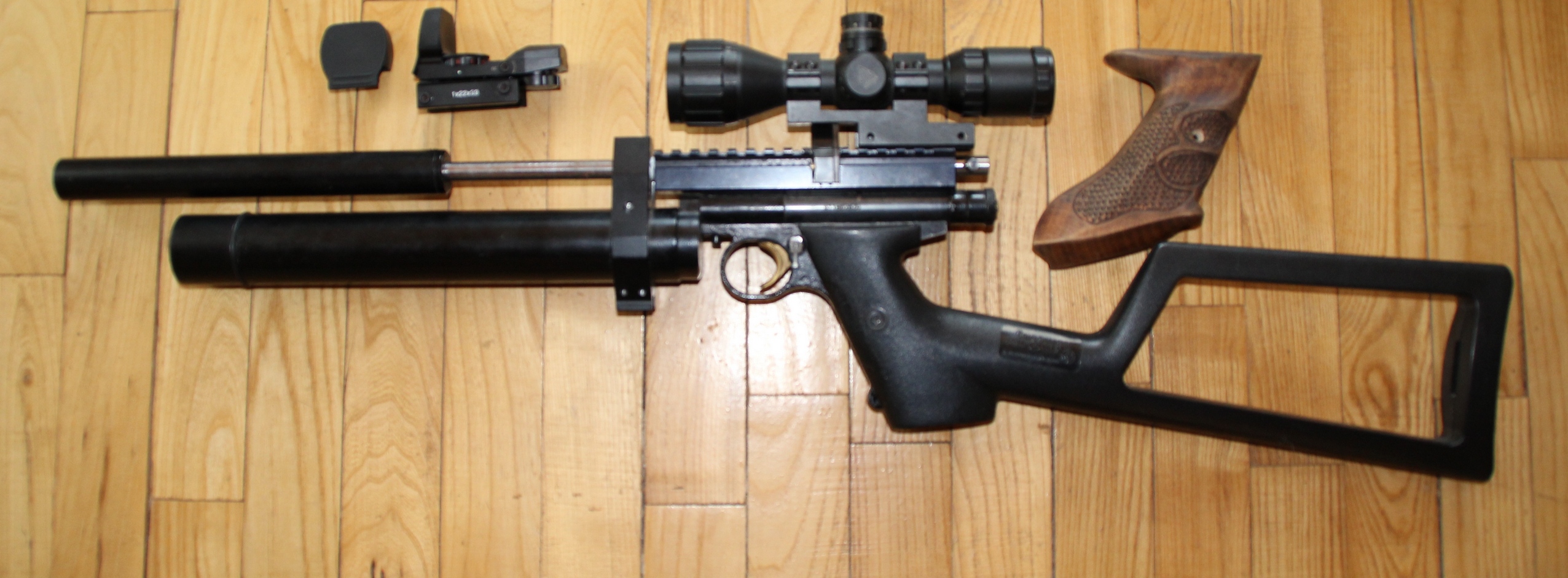 На мой взгляд(только мой,не навязываю никому),если снять этот приклад,установить саундмодератор на ствол по всей длине,ближе к концу резервуара(где манометр) поставить "восьмёрку поаккуратнее(как и вместо установленной) и так сказать "вмазать" всё это железо в новую деревянную ложу с выборкой под резервуар,то может получиться очень неплохой вариант.Рукоятки и меня если быть откровенным не вдохновляют.Просто владельцу стоит думаю покумекать над этим,думаю и продавать необходимость отпадёт сама собой,особенно если довести до ума всю систему.