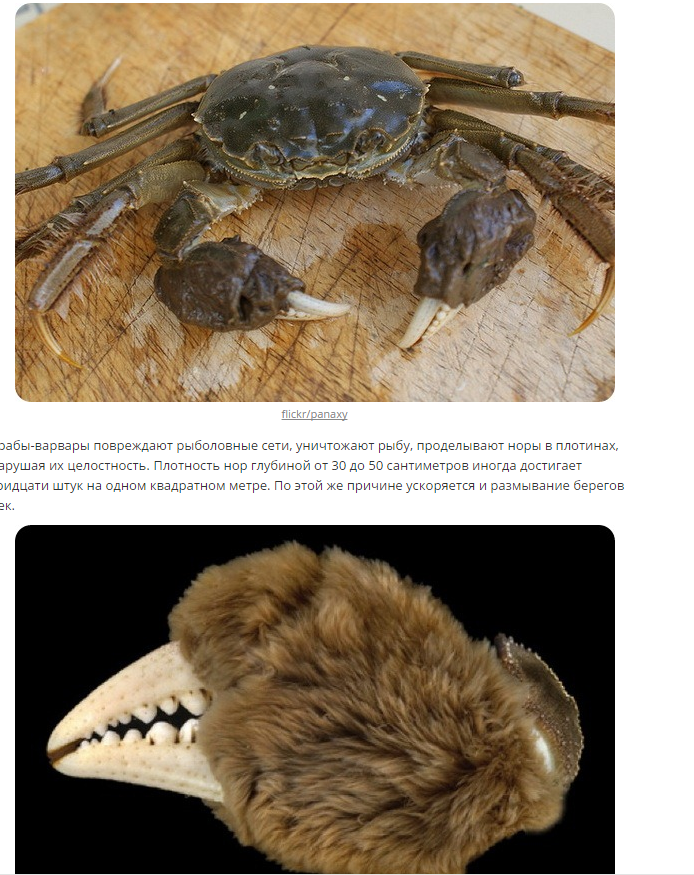 Китайский мохноногий краб (а в немецкой реке водился именно он!) в балластных цистернах судов, примерно в 1912 году, попал в реки бассейна Эльбы. Оттуда он начал быстро расселяться вдоль западных берегов Европы. В настоящее время он встречается практически во всех реках бассейна Балтийского моря. Следовательно, и в Беларуси тоже, хотя мне не приходилось пока слышать о том, что крабы попадаются среди уловов наших рыбаков и раколовов. Крабик этот оказался не слишком безобидным созданием. Говорят, что он активно рвет рыболовные сети и даже портит дамбы и плотины.