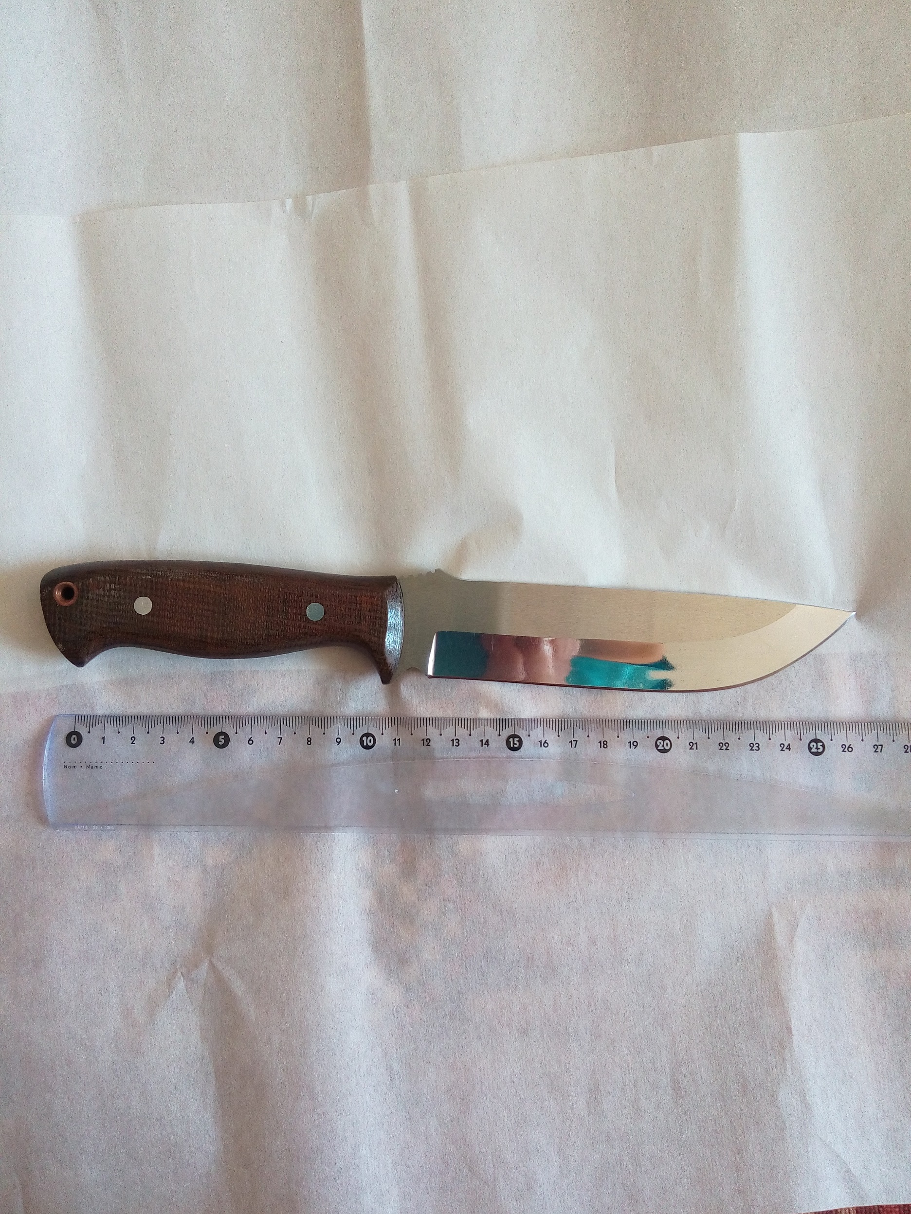 Нож делался по подобию чего-то среднего между Bark River Bravo 1 и Bark River Maroon Linen Micarta из стали 40х9с2, нож кованный и закален на 58HRC (проверено на заводе твердомером), рукоятка из текстолита. Длинна клинка 150мм, обух 2,8мм, ширина 34мм. Цена 450 000 рублей.