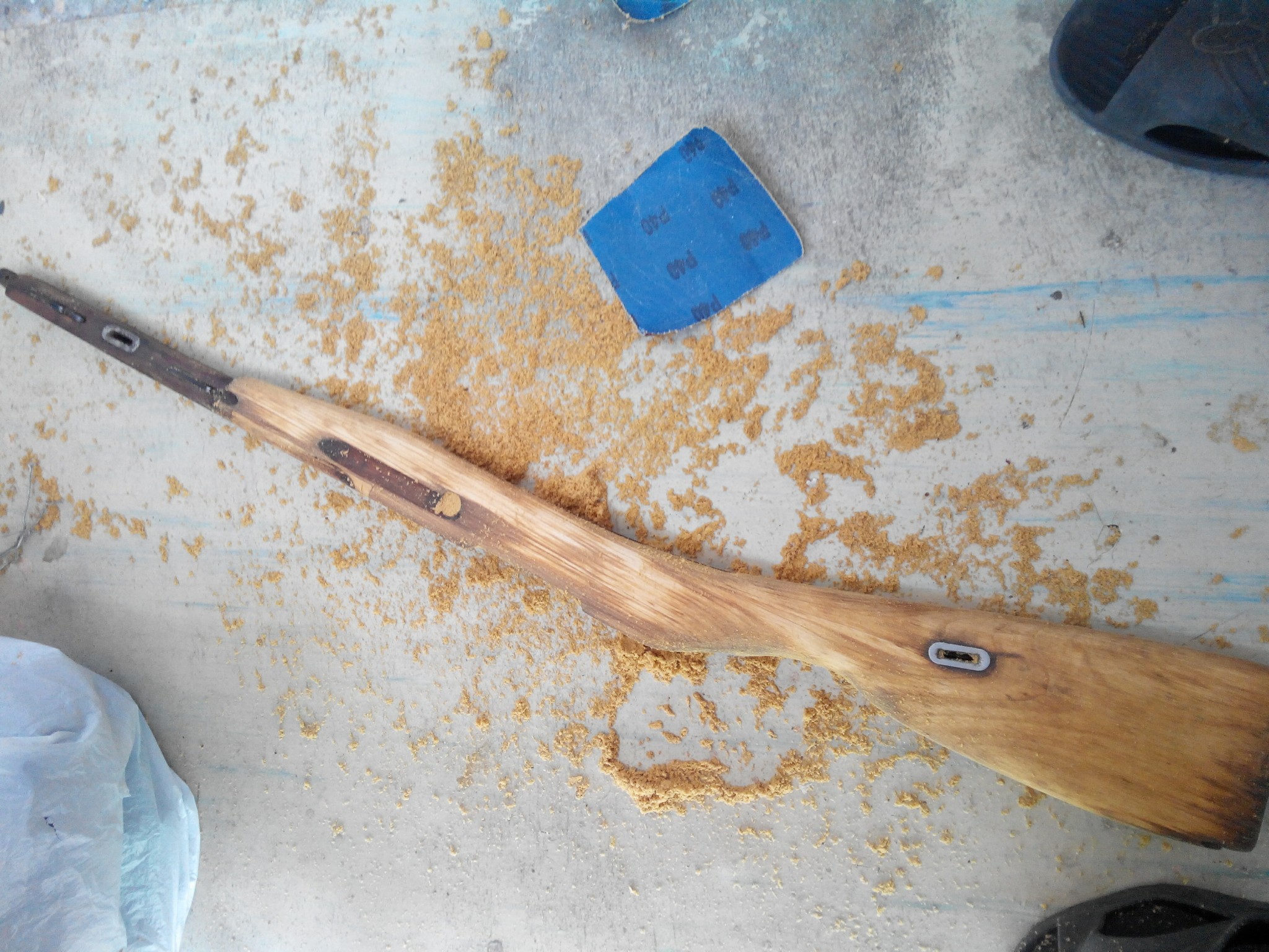 Хранились деревяшки эти видно утопленные в масле, потому что наждачка номер 100 ни в какую не желала шлифовать, ни пыли, ни стружки - реально забивалась какой-то воняющей субстанцией. Полазив по нету и поспрашивав людей сведущих в данной теме - взял 646 растворитель и начал втирать его. Ну хоть как то, с помощью 40й шкурки и какой-то матери, удалось соскрести верхний слой и шлифануть. Ни пыли , ни стружки - только рыжая каша - а как она горит!