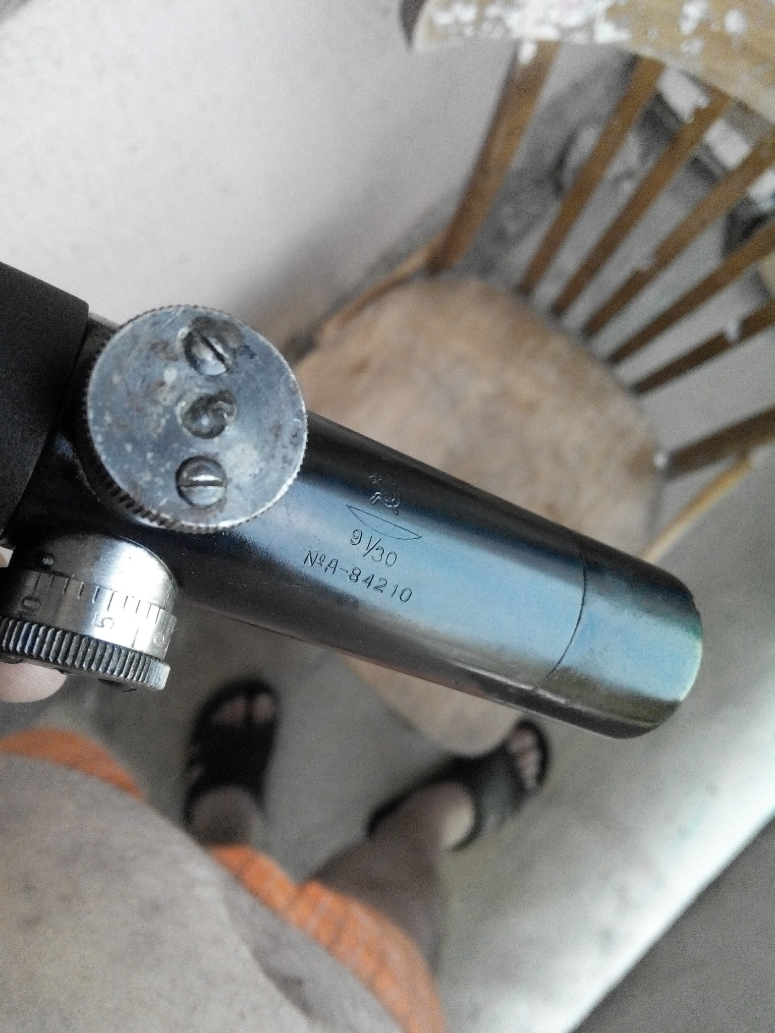 Для проекта был заказан в Питере оригинальный прицел ПУ. Состояние было не ахти из-за плохого хранения - кожаные колпачки раскисли и прилипли к трубке.