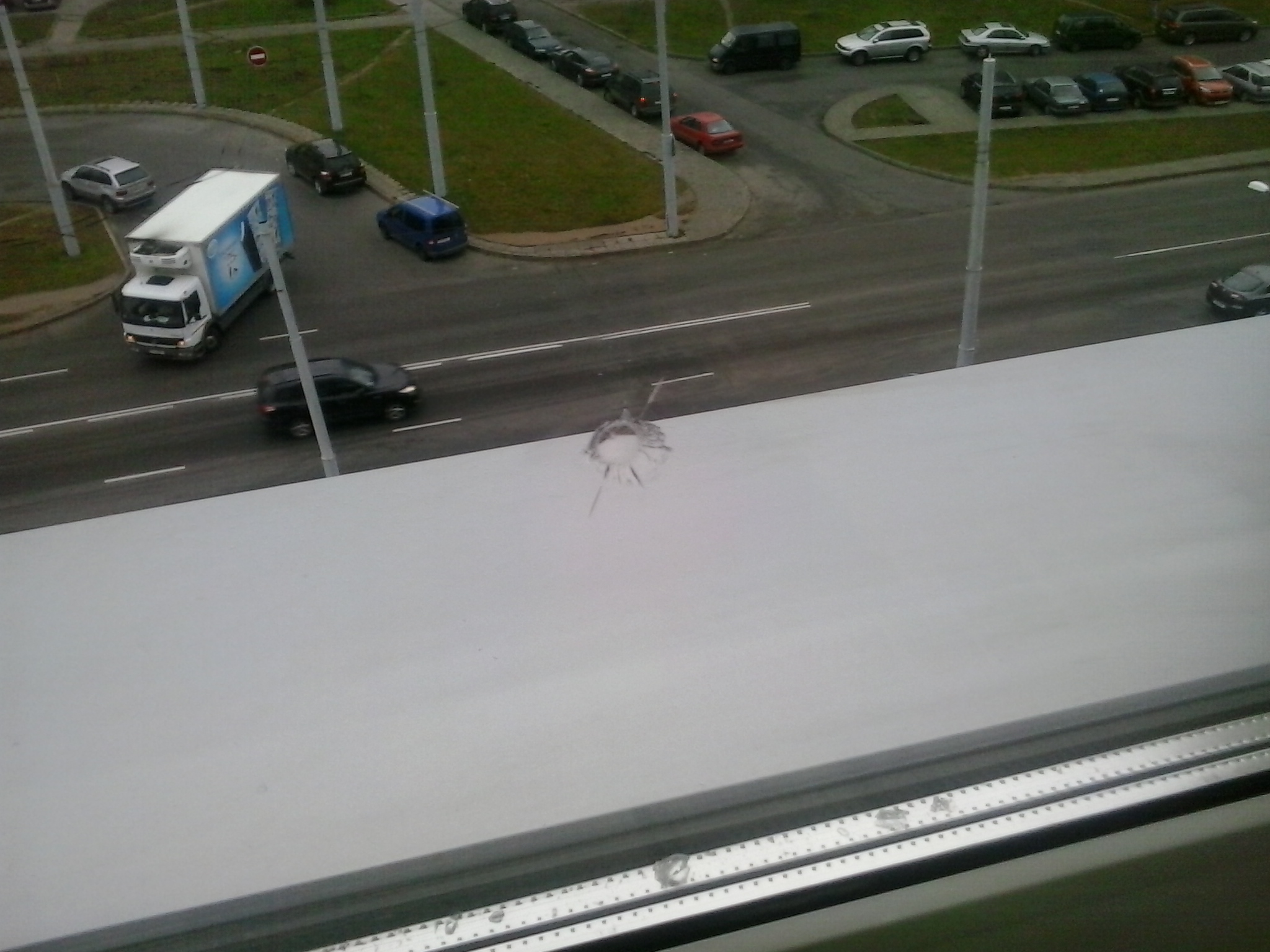 Да, только входное. Причем осколки вовнутрь высыпались, а снаружи только микро-дырочка. А окно это не мое. Там одним окном рядом большая начальница сидит, может кто из ее благодарных подчиненных :-), только на одно окно ошибся .