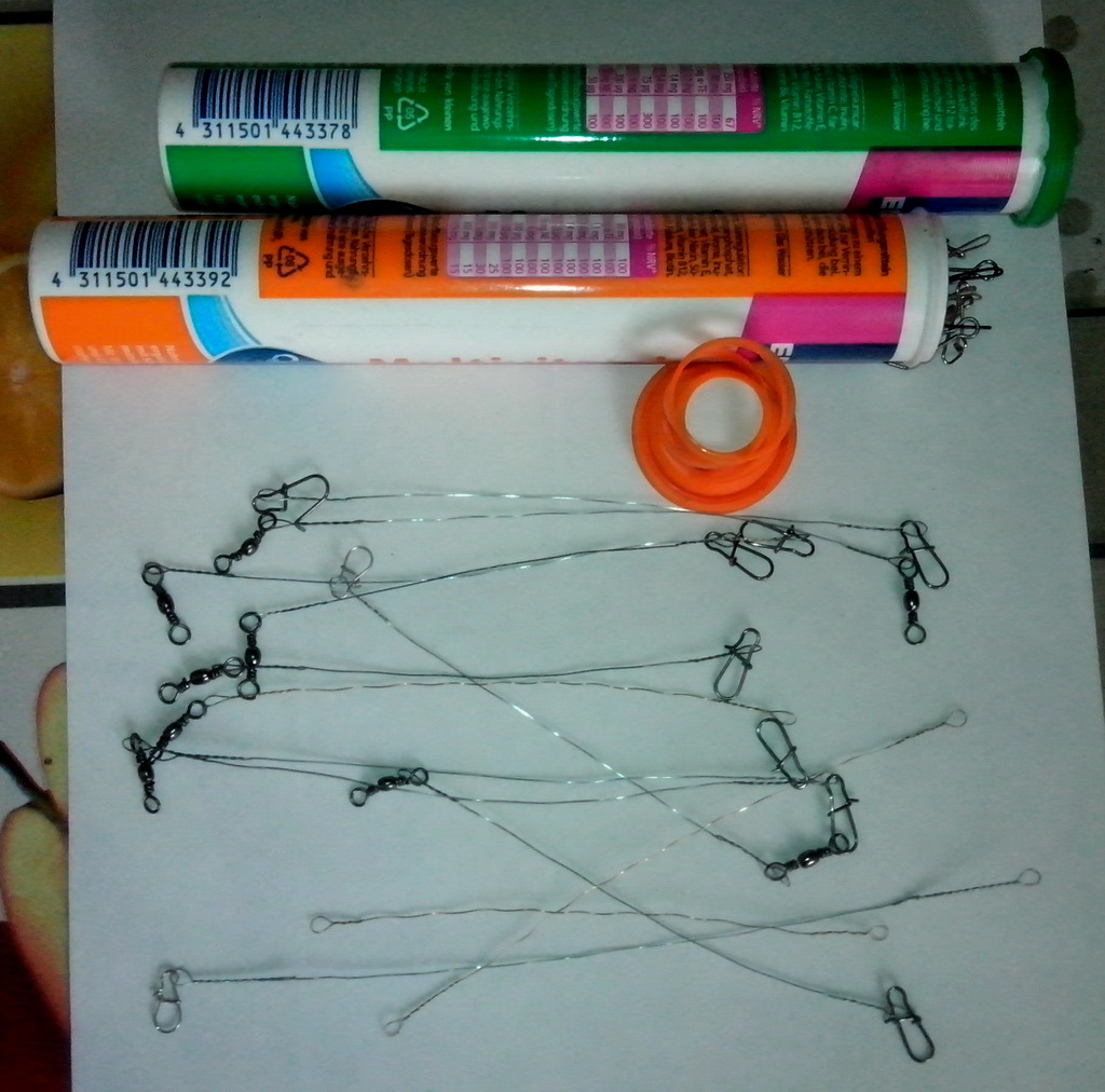 Поводки делаю из полевого кабеля, благо в нём имеются три стальные жилы из жёсткой нержавеющей стали диаметром 0.2 мм...