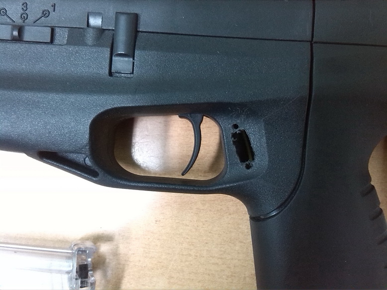 Осталось на рукоятке слева отверстие от кнопки лцу.