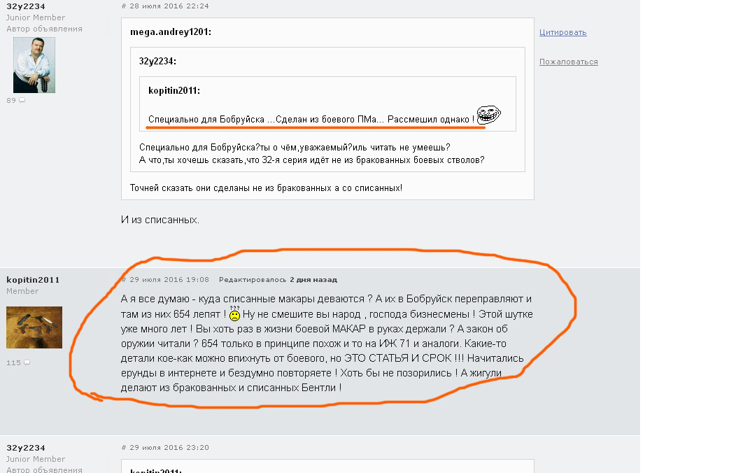 helg357 писал(а):Здравствуйте! Давно не даёт покоя один вопрос. Возможно я чего то не допонимаю, или где-то не разбираюсь, просвятите! Я не ярый макаровед, но имею МР-654 Н и МР-371, раньше ещё был 28серии. МР-ки уже у меня давно, 654-й не торопясь довожу до нормального вида. С сигнальником завязал, он у меня ещё безбородый, и чёто с ним делать нет желания. Кстати насчёт 371, многие спрашивают, зачем увеличили окно выбрасывателя? Всё просто, никто ни чего не увеличивал, сигнальник переделывали из травмата, а гильза травмата длиннее чем у боевого, вот и разница в размерах. Но это я отвлёкся. А вопрос вот в чём! Где достоверно почитать про красный ЗИП? В частности про курок и предохранитель? На каких моделях или в каких годах они использовались? Не скажу что перерыл Весь интернет,но покопаться основательно, и ничего не нашёл! У меня двоюродный брат, с 1986 по 2007 год работал в милиции, один дядька ещё при Союзе проходил военную службу в тогдашнем ГДР, второй служил в Афгане, и никто из них никогда не видел красных курков или предохранителей. И я теперь иногда интересуюсь, то у гайцов, то у инкассаторов. Никто красного зипа в глаза не видел! Так вот попахивает всё это,разводом, толи продавцов толи производителя! Не знаю на теперешний день, но год назад сам покупал по 25$ за штуку. Допускаю что была, какая то ограниченная партия макаровых с красным зипом, или спец серия, не знаю. Но тогда такой интерес к красному зипу должен быть у коллекционеров, кто собирает полную коллекцию! А не поголовно, кто купил 654-й, давай пихать туда красные деталюшки. О какой аутентичности может идти речь, если во всех службах на вооружении макаровы с чёрным зипом, а мы пихаем красный? Где ? схожесть с боевым ???