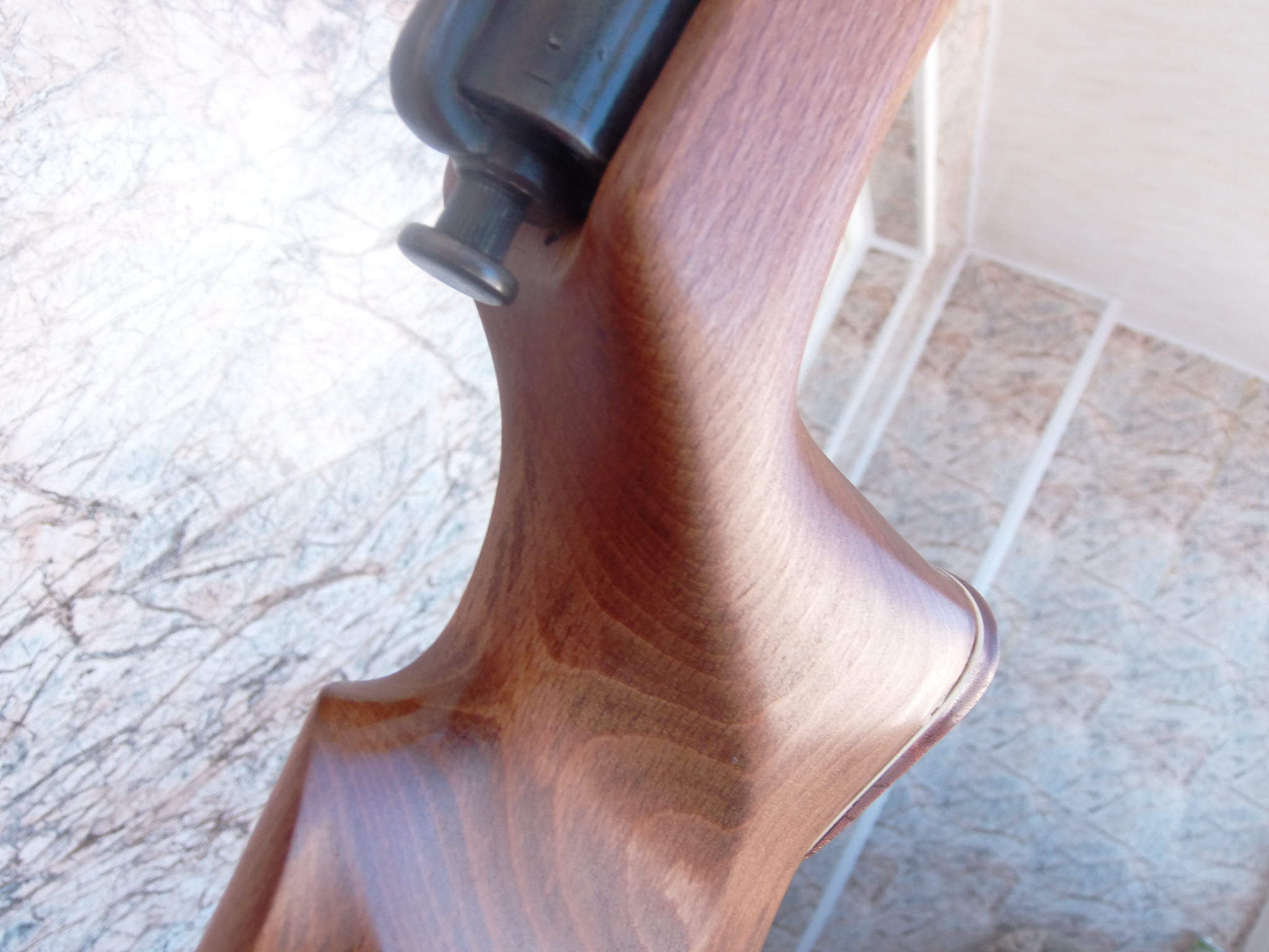 Ну а потом приступил к финальной шлифовке ложи.Обрабатывал наждачками от 400 до 1000.Тщательно,каждый уголок,в идеальном виде слил воедино с ложей чёпик на рукояти и «носик» цевья.После казалось бы идеальной шлифовки снимал ворс.Мочил ветошь кипятком,хорошенько отжимал тряпку,и влажной(НЕ МОКРОЙ!!!) натирал ложу.Ворс поднимался сразу!Опять наждачку в руки,строго по волокнам от 800 до 1500 нулёвки проходил по всей ложе.Повторил процедурку такую трижды!!!Последней пользовался нулёвкой «мирка 2000-2200». Чтобы показать результат «заказчику» собрал винтовку.Приладил и затыльник,и скобу спусковую, вставил своё «железо» со своим надульником.Сфоткал для ознакомления владельцу будущему-посмотрите и вы,что выходило из затеи этой: