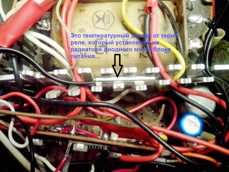 На нижнем фото термореле стоит на верхней панели и показывает текущую температуру радиатора диодного моста. Когда эта температура достигнет 50°С, то реле включит вентилятор...