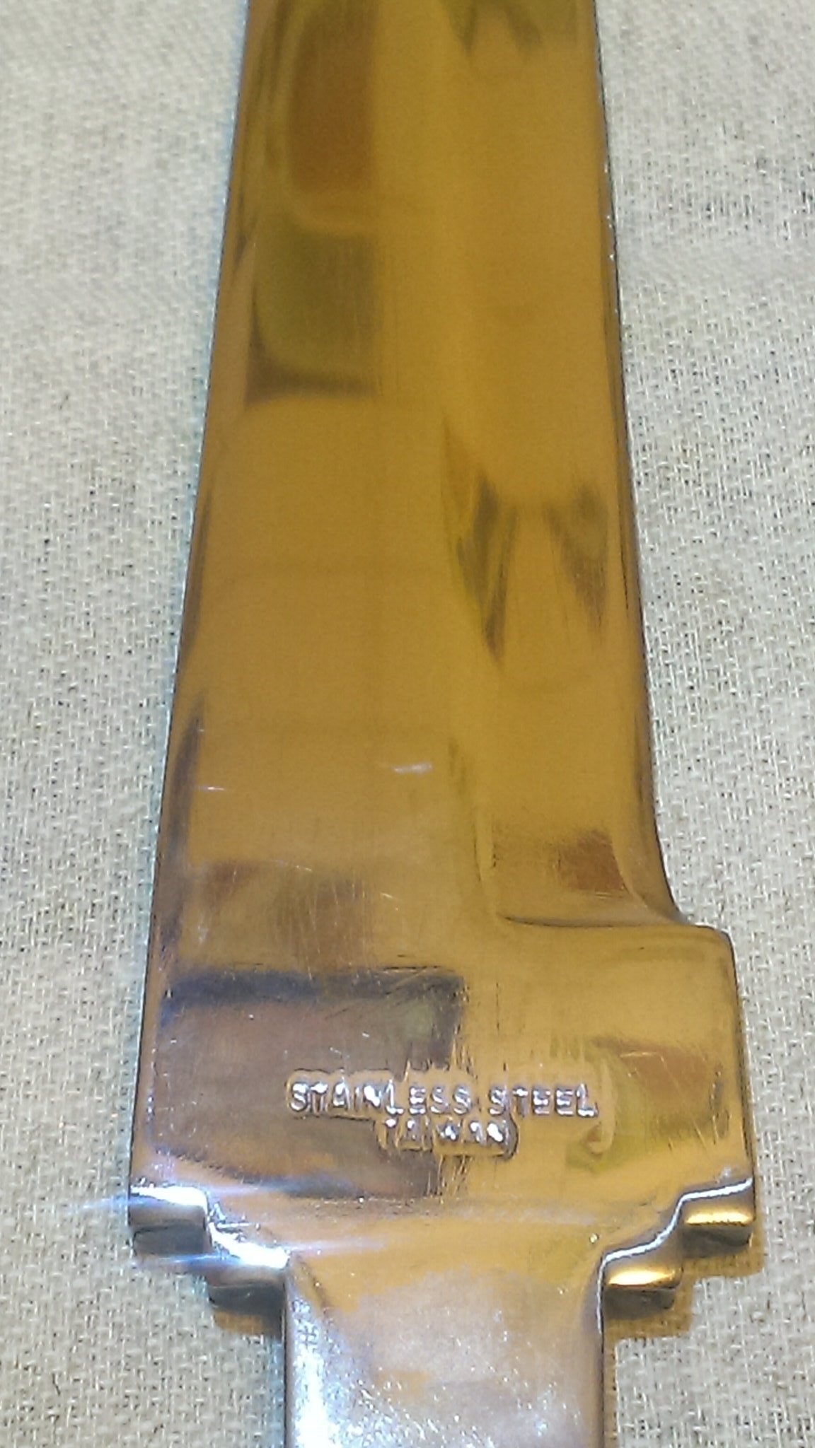 Был куплен в 1997 году. Отслужил верой и правдой. Вновь отполирован,заточен для продажи. Гарда из нержавеющей стали,как и клинок. Рукоять-резинопластик. Навершие из латуни,с никелированным покрытием, позволяет использовать нож в качестве молотка. В навершии имеется отверстие для крепления страховочного шнура. Резиновые крепления ножен канули в Лету.