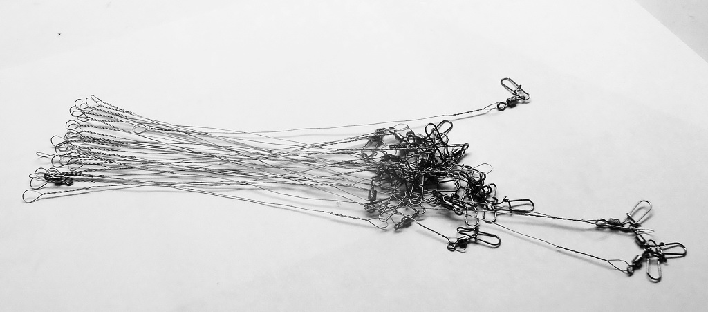 Поводки делаю из полевого кабеля, благо в нём имеются три стальные жилы из жёсткой нержавеющей стали диаметром 0.2 мм...