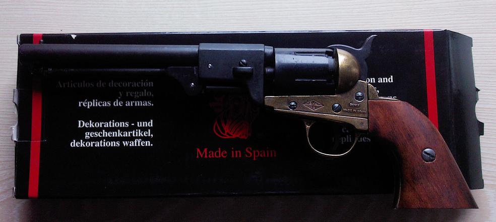 Не совсем ММГ, но визуально схожее изделие, напоминающее капсюльный револьвер Кольта образца 1851 года. Вроде как испанский. Производитель Denix, модель DE-1083-L. Подвижный барабан и рычаг запрессовки, УСМ только двойного действия, без самовзвода.