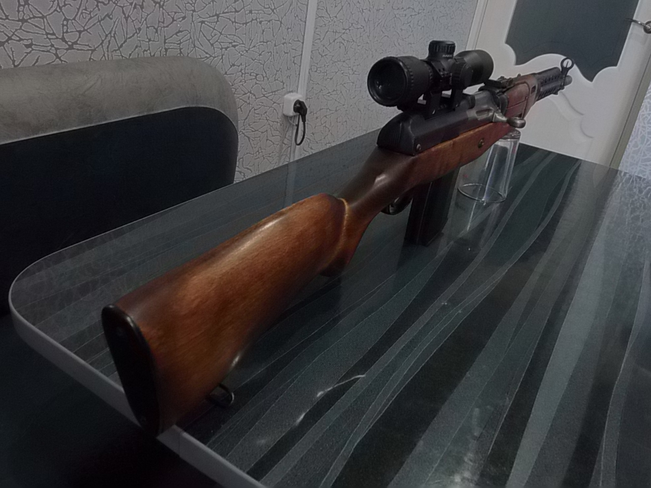 Карабинчик по весу приближён к оригиналу-вес 3,9кг с оптикой. В общем не особо лёгкий,но сбалансированный.