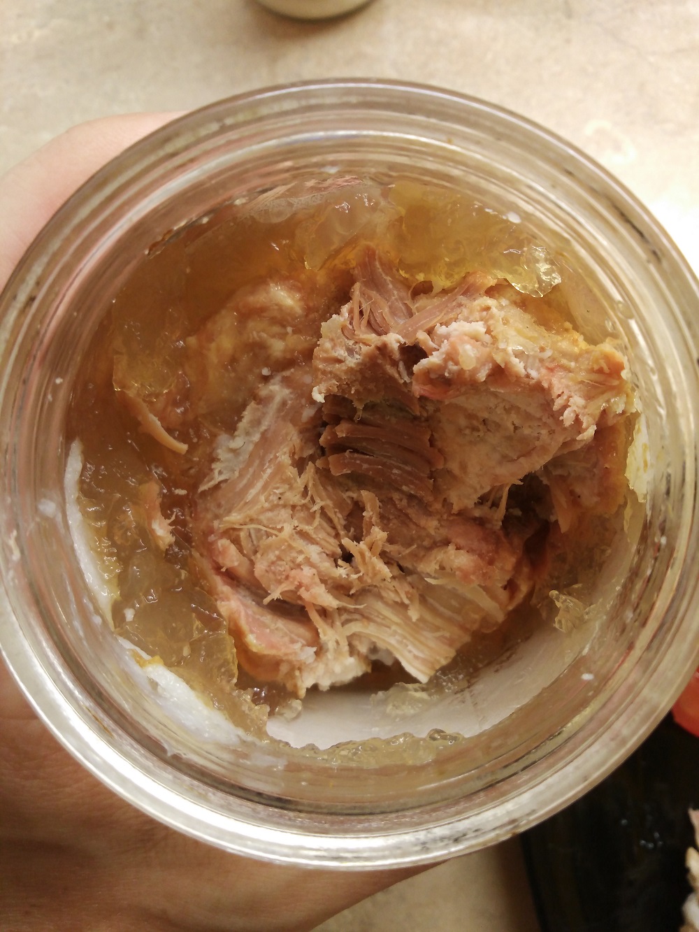 Верхний слой банки, совсем небольшой слой жира, немного желе. И МЯСО, на фото не очень понятно, но это именно мясо. Волокнистые куски, не соединительная ткань.