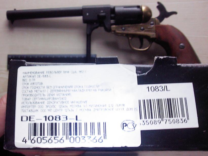 Не совсем ММГ, но визуально схожее изделие, напоминающее капсюльный револьвер Кольта образца 1851 года. Вроде как испанский. Производитель Denix, модель DE-1083-L. Подвижный барабан и рычаг запрессовки, УСМ только двойного действия, без самовзвода.