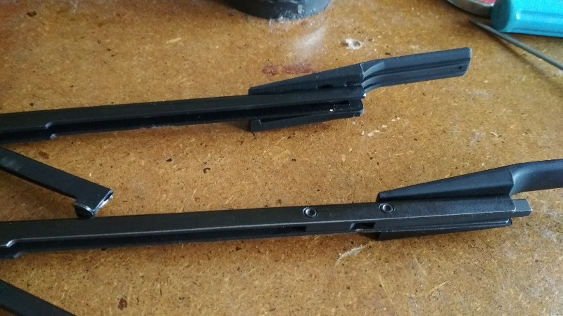 Здравствуйте. Спасибо Паше, что создал эту тему. Слежу за ней с самого начала, параллельно читал Ганзы, там есть тема от Джона Джека, он изучил все аспекты этой винтовки именно в СО2 варианте и сейчас занимается продажей китов для неё. Я люблю СО2 винтовки и хотел приобрести МР-553, но количество косяков и переделок меня останавливало. С трубой весом 600 гр понятно, её достаточно заменить на 88 гр баллон, но длинный рычаг можно только обрезать, но всё равно не то. Можно установить ударку Крюгера, но её тоже нужно переделывать и по весу я точно не знаю подойдёт ли. Ещё один важный для меня косяк, это возможность взвести её повторно и загнать ещё одну пулю в ствол, а дети могут и весь магазин загнать. Но вот вышла МР-555. Взвод отличный, ну в сравнении конечно, плюс есть защита от повторного взвода, но она только в ПСП. Ну и начала меня посещать мысль, вот бы сделать МР-555 на 88гр СО2. В общем набрёл я как-то на Солигорский магазин и в каталоге товаров увидел переднюю пробку, она же корпус клапана МР-553, там же было и цевьё и восьмерка и ствол. Я сразу всё и заказал. Потом на Валдбериз заказал муфту МР-61 в сборе, там весь УСМ, досылатель и даже передняя пластиковая пробка. Длинное шептало с двумя винтами регулировки. Так же на Валдбериз я купил почти весь механизм ударной группы МР-555, не было только самого рычага взведения. Ну думал потом найду и докуплю. К сожалению рычаг я так и не нашёл. Вернее а одном из Российских магазинов я его нашёл, но продавец мне даже не ответил на моё сообщение. В общем все железки ко мне пришли и настало время собирать. А рычага нет и найти его я не могу. На странице продавца было фото этого рычага и рядом лежала линейка, я скачал картинки, там их было две, с двух сторон. Подогнал на мониторе размер, чтобы совпадало с моей линейкой, приложил к экрану толстую прозрачную пленку и обвёл её маркером. Вырезал ножницами по контуру, прикладывая к монитору и сверяя, потом пошёл в гараж и нашёл кусочек текстолита толщиной 3мм. Ножовкой по металлу и напильником придал ему форму рычага, собрал ударку и проверил, кое что подогнал и в принципе всё заработало. Дальше попросил у знакомого отрубить мне заготовку из металла 5 мм. Ну и опять гараж, ножовка, напильник. Потом ещё ходил к сварщику, там нужно было наплавить металла под кольцом предохранителя. Ну вот и готова ударка, но в трубу компрессора она не входит, нужен пропил, я конечно боялся, что это ослабит трубу, но зря. В общем дримель в руки и вперёд. Трубу пропилил, ударка стала на место и всё работает. Заднюю муфту сделал из дюралевой болванки, подогнал по внутреннему диаметру трубы компрессора и по длине как в ИЖ-60. Вместо штифта нарезал резьбу М4 и с двух сторон закрутил винтами в потай. Брал винтовку за заднюю муфту и трёс, понятное дело люфта нет совсем и вряд-ли он появится. Сам клапан и прокладку купил от МР-651, расширительную камеру заказал у токаря, по типу как у Джона Джека с Ганзы, но чуть по больше. Теперь мне нужен был баллон на 88 гр. И конечно с ним были проблемы, я и тут на форуме в спросе создавал тему и по магазинам искал, нигде нет. Но как говорится кто ищет, тот найдёт, в одном из интернет магазинов нашли завалившийся за полки баллон. Ну вот вроде уже и всё есть. Но когда всё собрал, оказалось восьмерка от МР-553 малавата под 88 гр баллон, но в принципе с её помощью я снял размеры и сделал эскиз нужной в