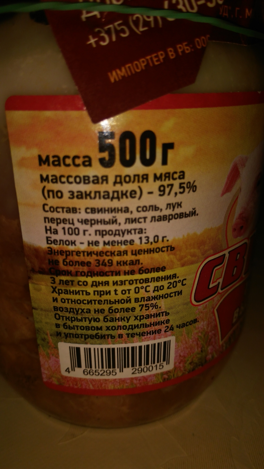 На вид все отлично, видно МЯСО, сама жировая прослойка у горловины банки никакая. Визуально кажется не больше сантиметра. Металлическая крышка закрыта буклетиком импортера и перетянута резинкой. Состав тушенки говорит сам за себя. Ничего тут и не прокомментируешь.