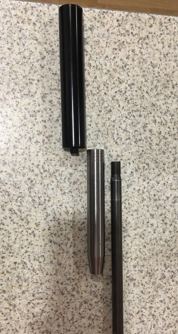Утяжелитель: материал шток амортизатора, длина 142мм, диаметр 20,5мм, внутренний диаметр 13,5мм резьба под ствол М12х1, резьба под модер М10х1 вес 195гр. Удлиняет ствол на 10мм. Модератор: онодирован, длина 150мм, диаметр 26,5мм, резьба к надульнику М10х1. Внутри пустой, глушит хорошо(кому мало, можно во внутрь напихать чего, по вкусу) передняя пробка на резьбе. Цена утяжелитель плюс модер 60рублей.