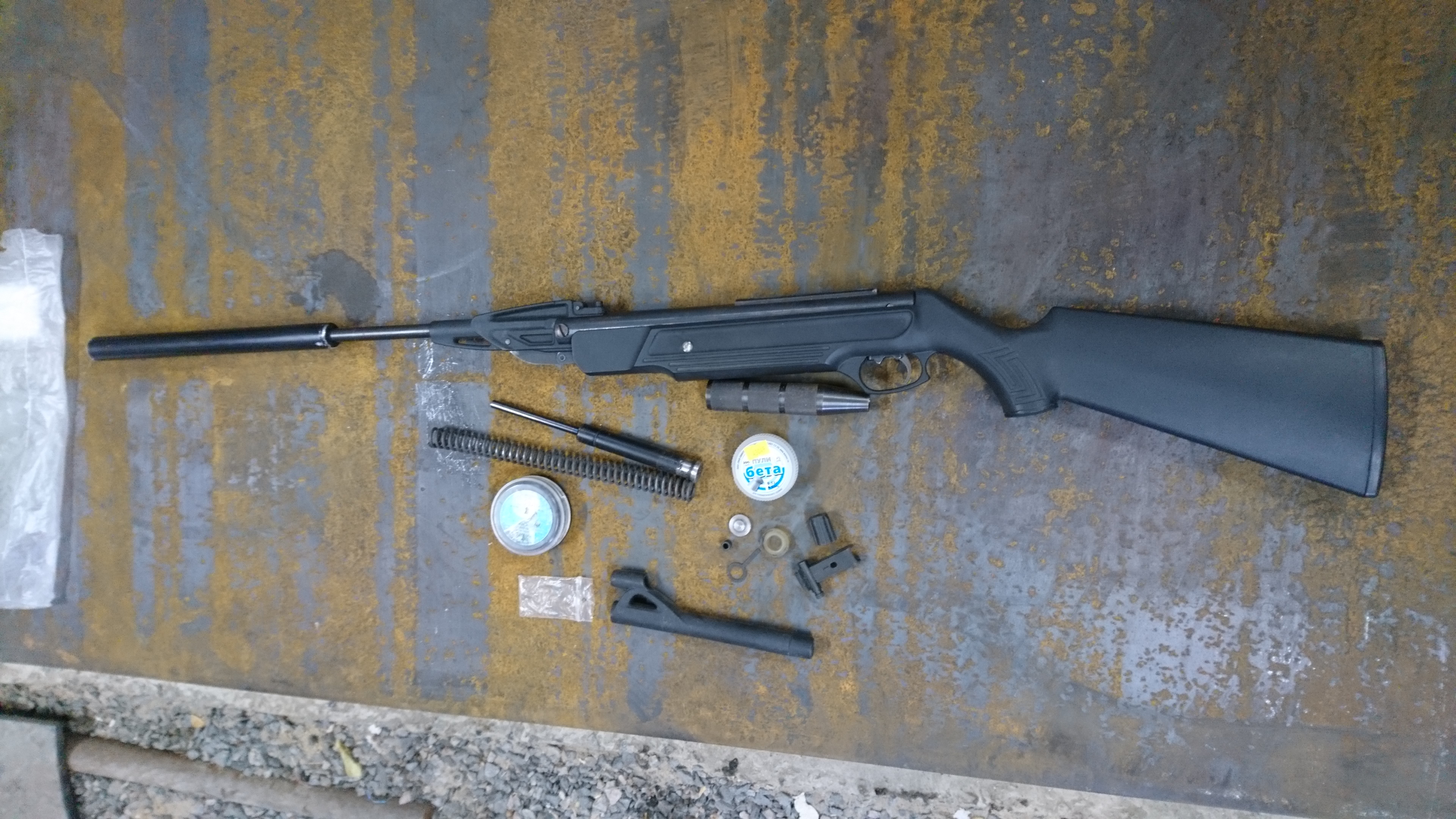 Продам пневматическую винтовку с утяжелителем ствола +саундмодератором + стандартная пружина+ газовая пружина севшая+ хорошая газовая пружина установлена+пульки+мелочовка = 100 рублей