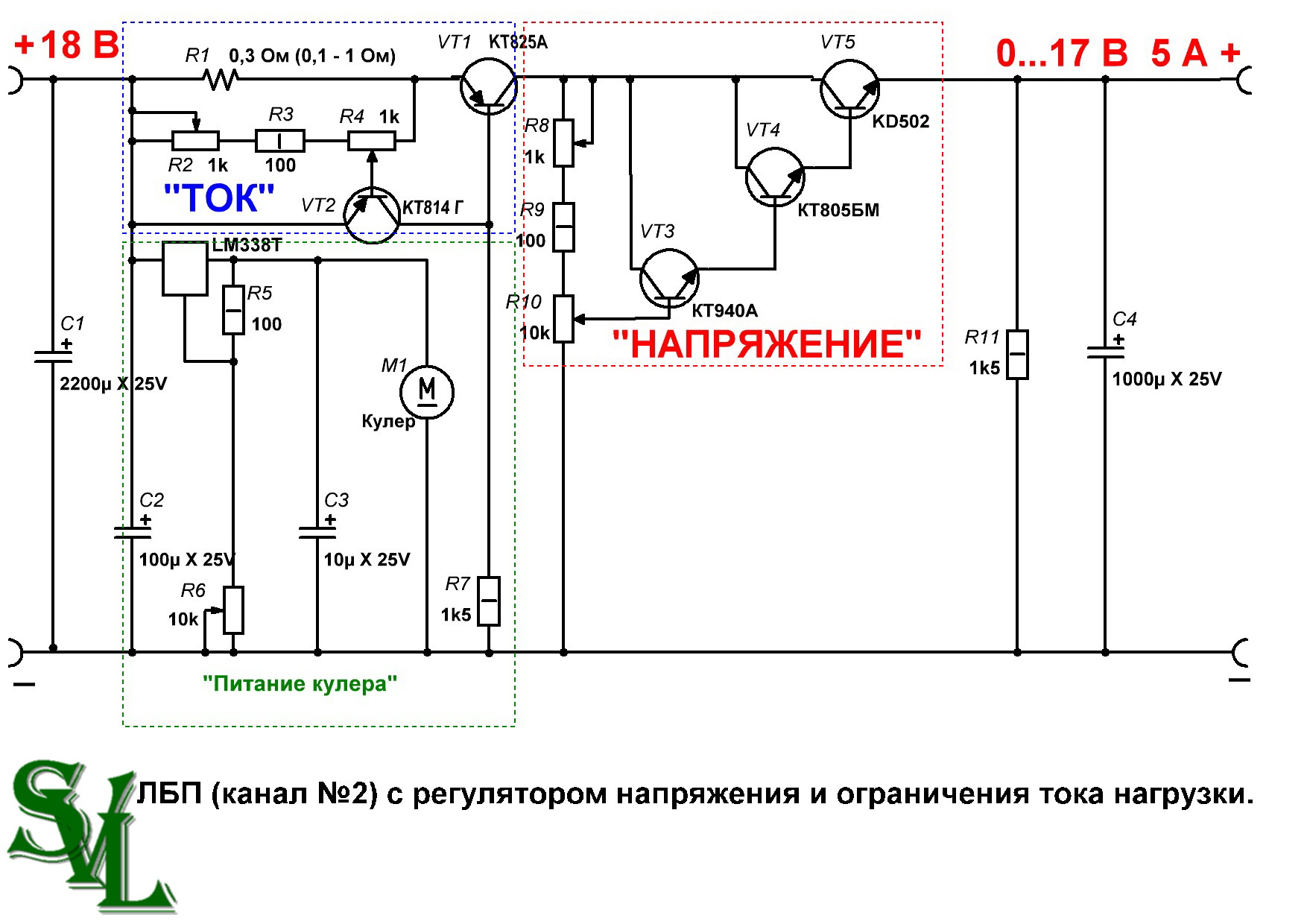 3)В схеме на 17В небольшая ошибочка - С2 подключен бестолково . Его "+" должен подключаться к точке соединения R5, R6 и LM338Т. В резисторе R8 нет особой необходимости - он только ограничивает максимальное выходное напряжение , для этого достаточно одного R9 . Ну а для "понтов " вместо R6 для регулирования оборотов кулера в зависимости от температуры транзистора V5 можно воткнуть терморезистор , закрепив его на соответствующем радиаторе