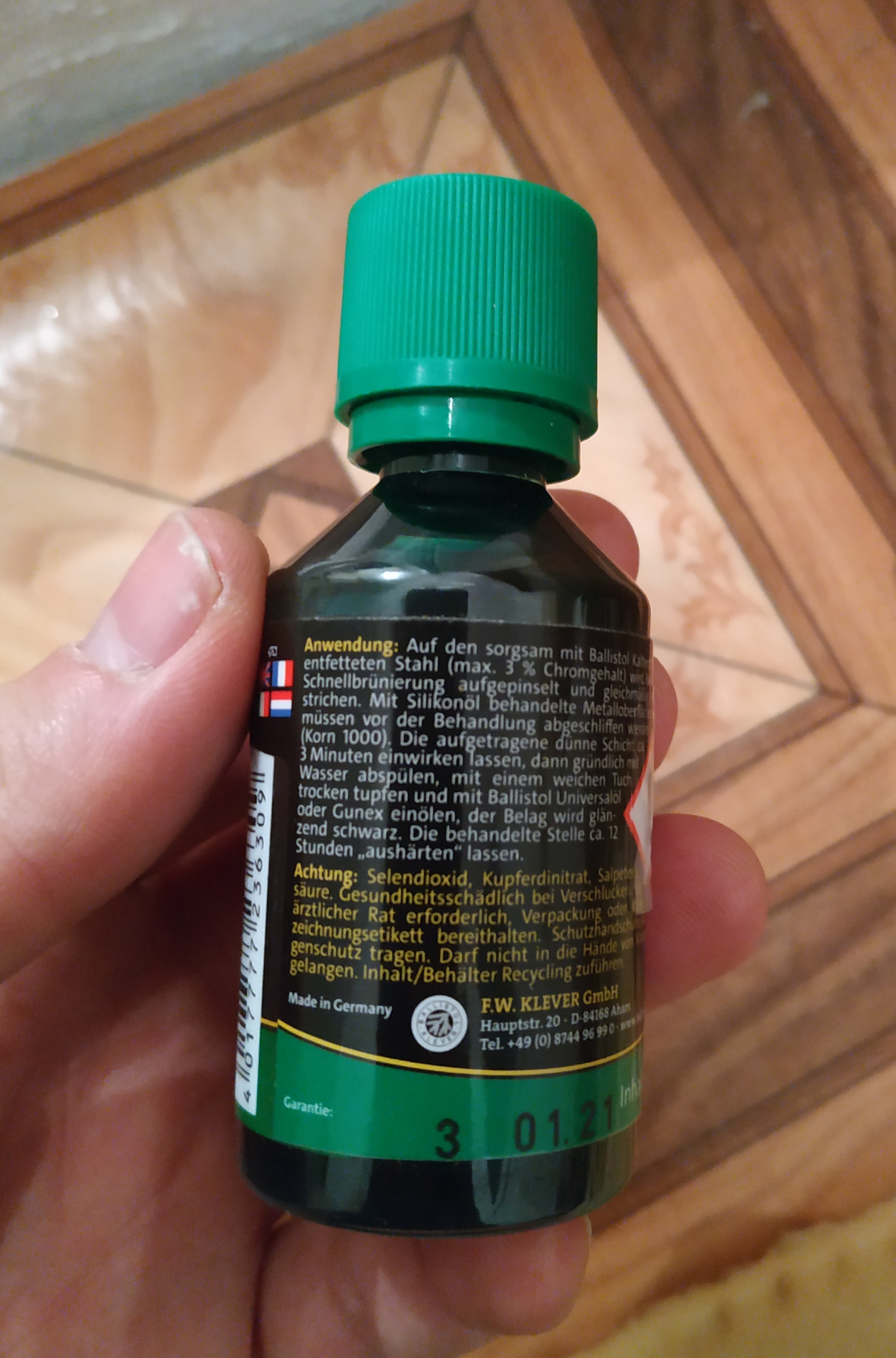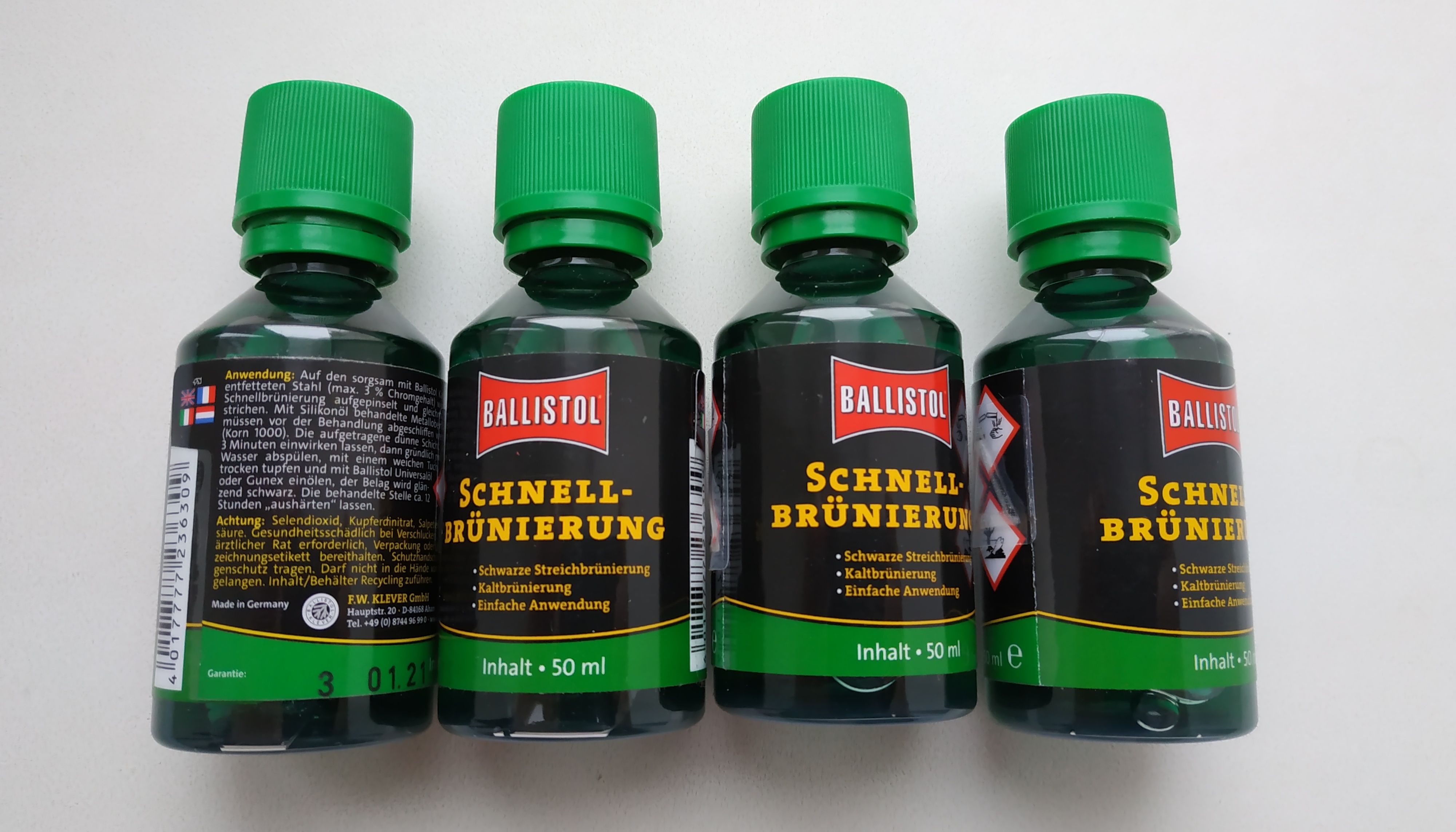 Оружие должно быть тщательно очищено от жира и смазки. Затем нанесите средство для воронения Klever с помощью кисточки на поврежденный участок. Вскоре после нанесения (примерно 3 минуты) появится жёлто-белое покрытие, которое следует смыть водой. Далее высушите обработанную поверхность мягким платком и нанесите спрей BALLISTOL.
