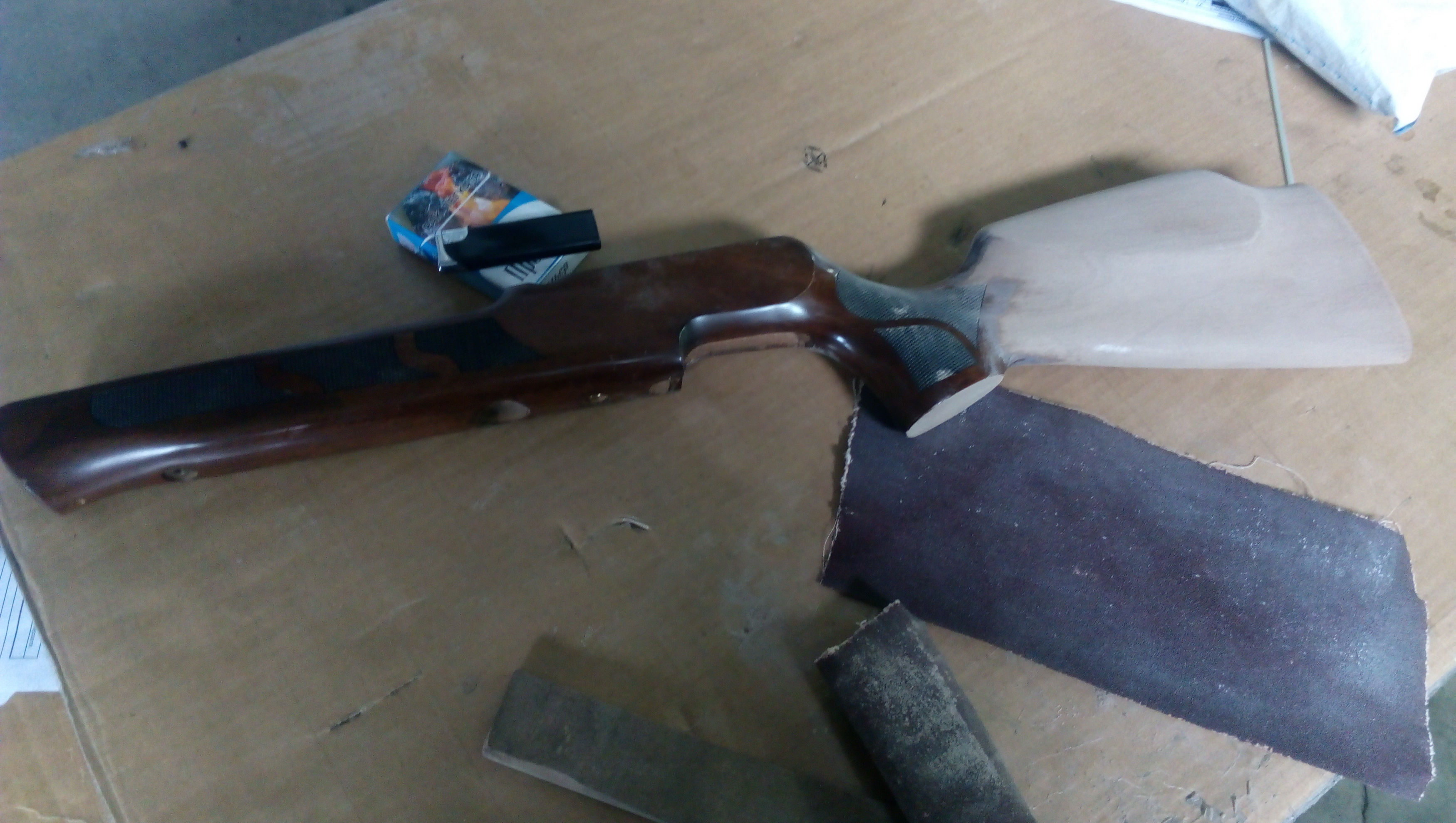 Первым делом конечно надо было шкурить её от нанесённого лака-и лак не хотелось чтобы был, да и коцки были на ложе в виде вмятинок и т.д. Принялся наждачкой Р80 на оправках поперек волокон её чистить: