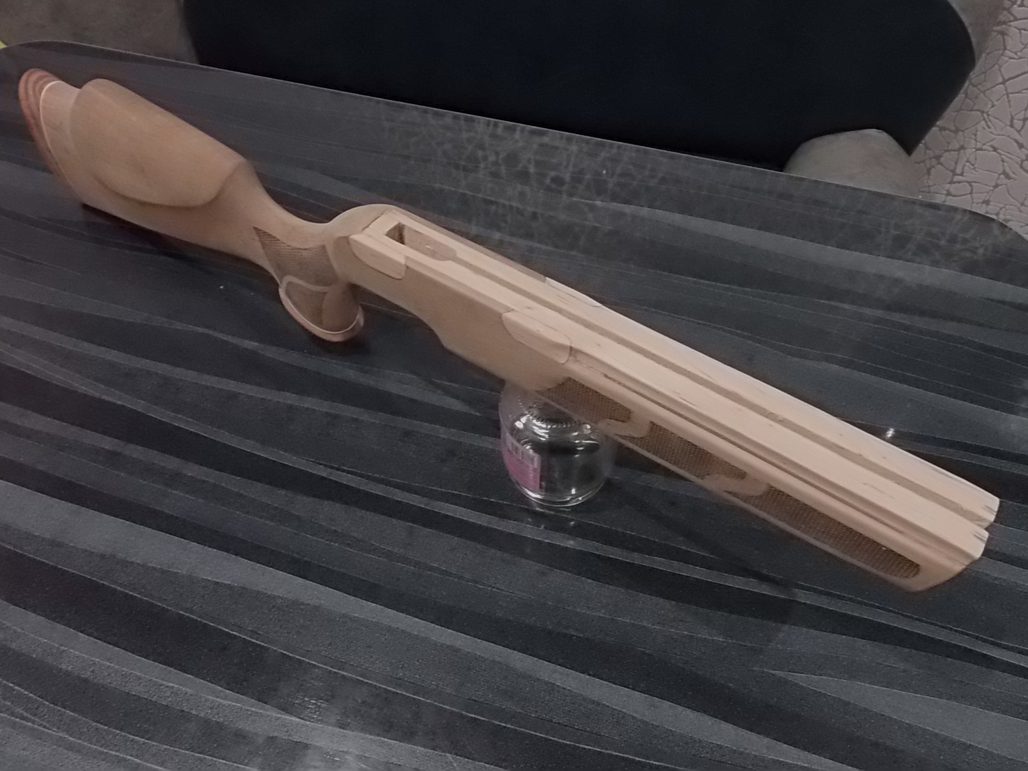 Обдумывал чтобы такое ему сваять, вспомнил что ка-то прикупил на нашей барахолочке ложу ореховую от турецкой РСР винтовки «KRAL». Конкретно для чего-то я тогда её не брал. Взял именно на «а вдруг сгодится», тем более цена была вполне приемлема за неё. Решил попробовать именно её адаптировать для «Мурки». Примерил-конечно очень не подходила. Но если доработать-вполне годной обещала стать. Ну принялся дорабатывать.