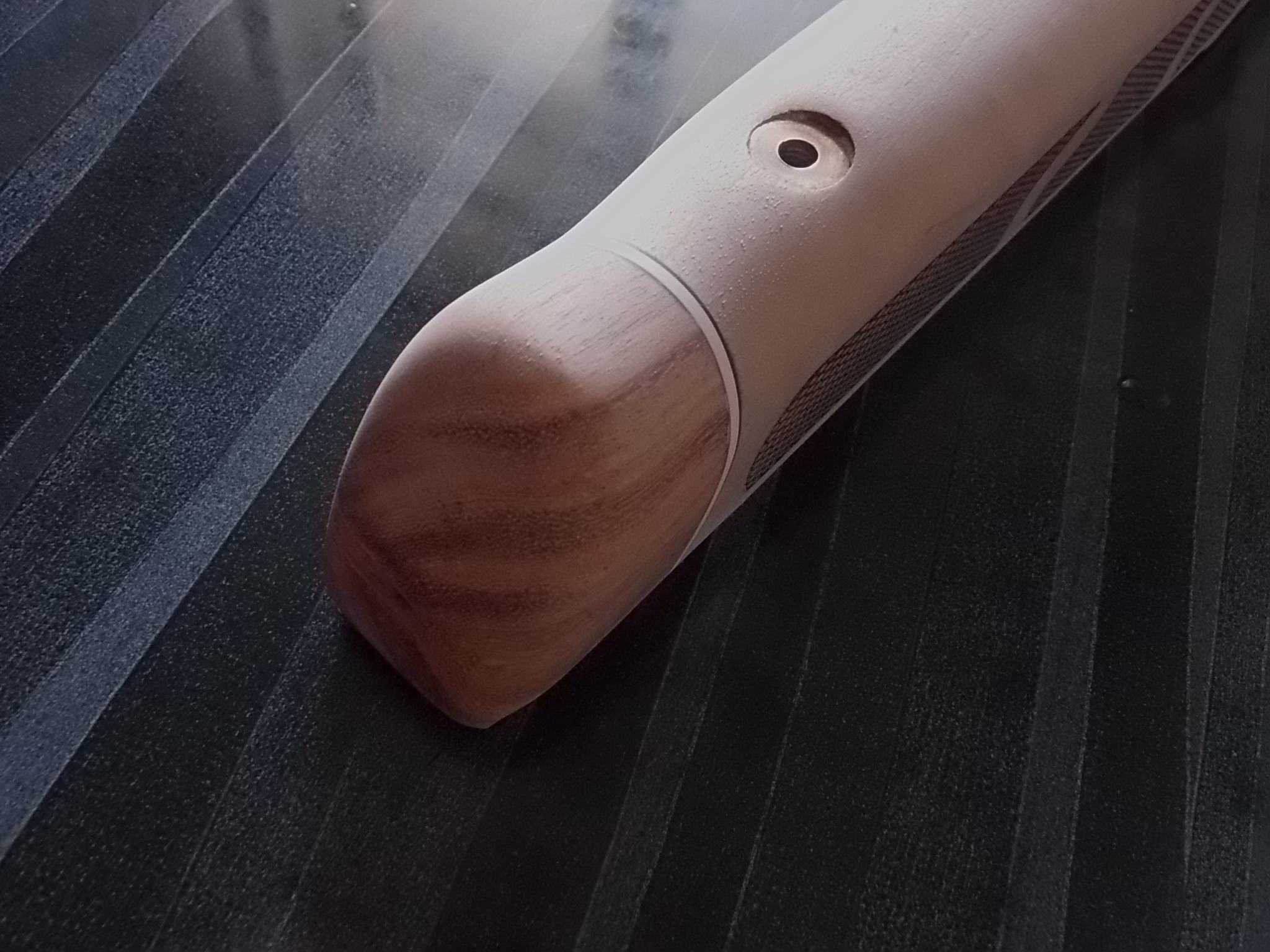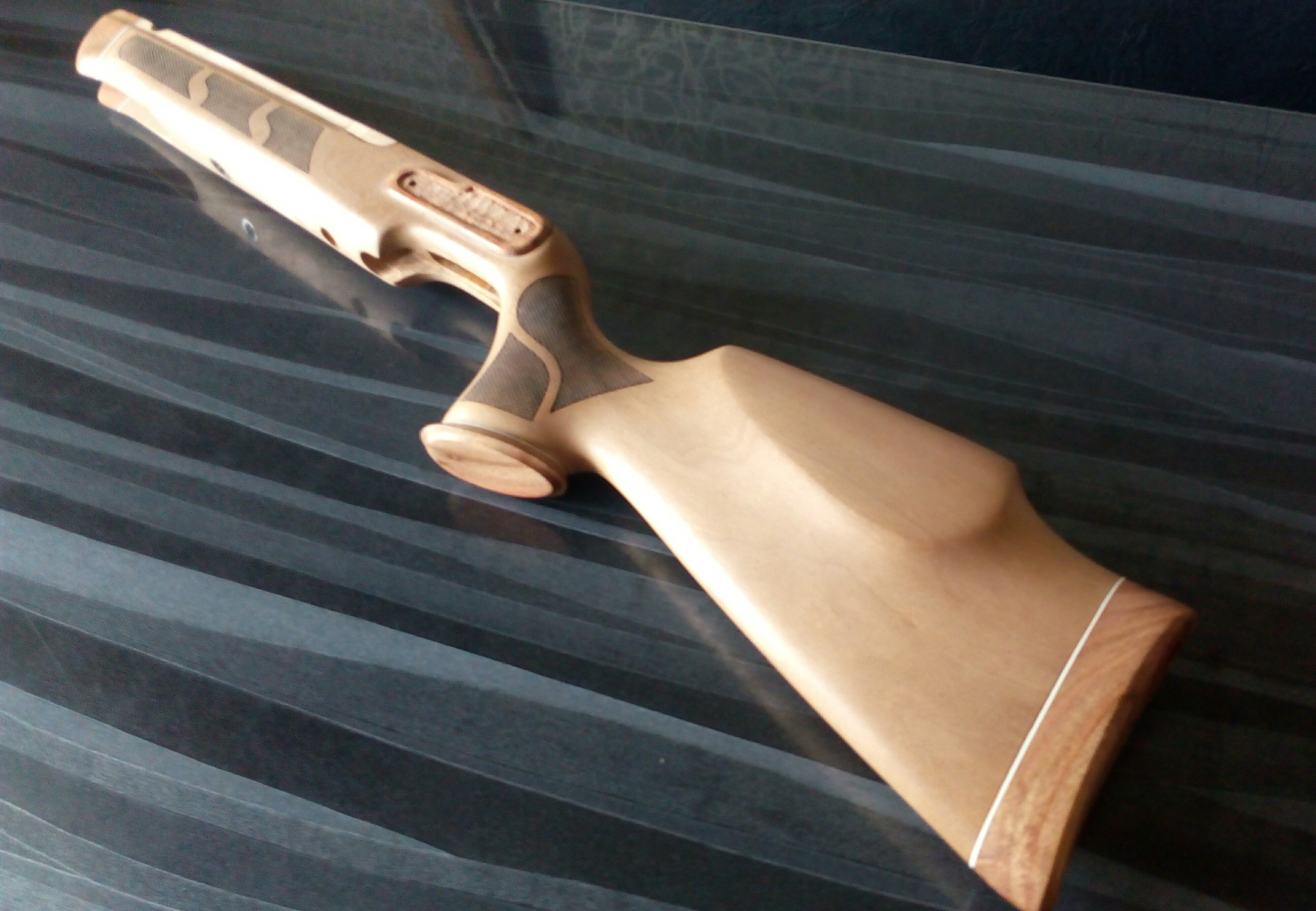 После закрепил её надёжно на рукояти винтовки. Между пяткой и рукоятью сделал прокладку из белого ПВХ пластика от электрокороба. Легко обрабатывается, полируется и даже после нанесения пропитки всё равно остаётся белый. После высыхания клея обработал пятку с прокладкой и слил с рукоятью. Итог: