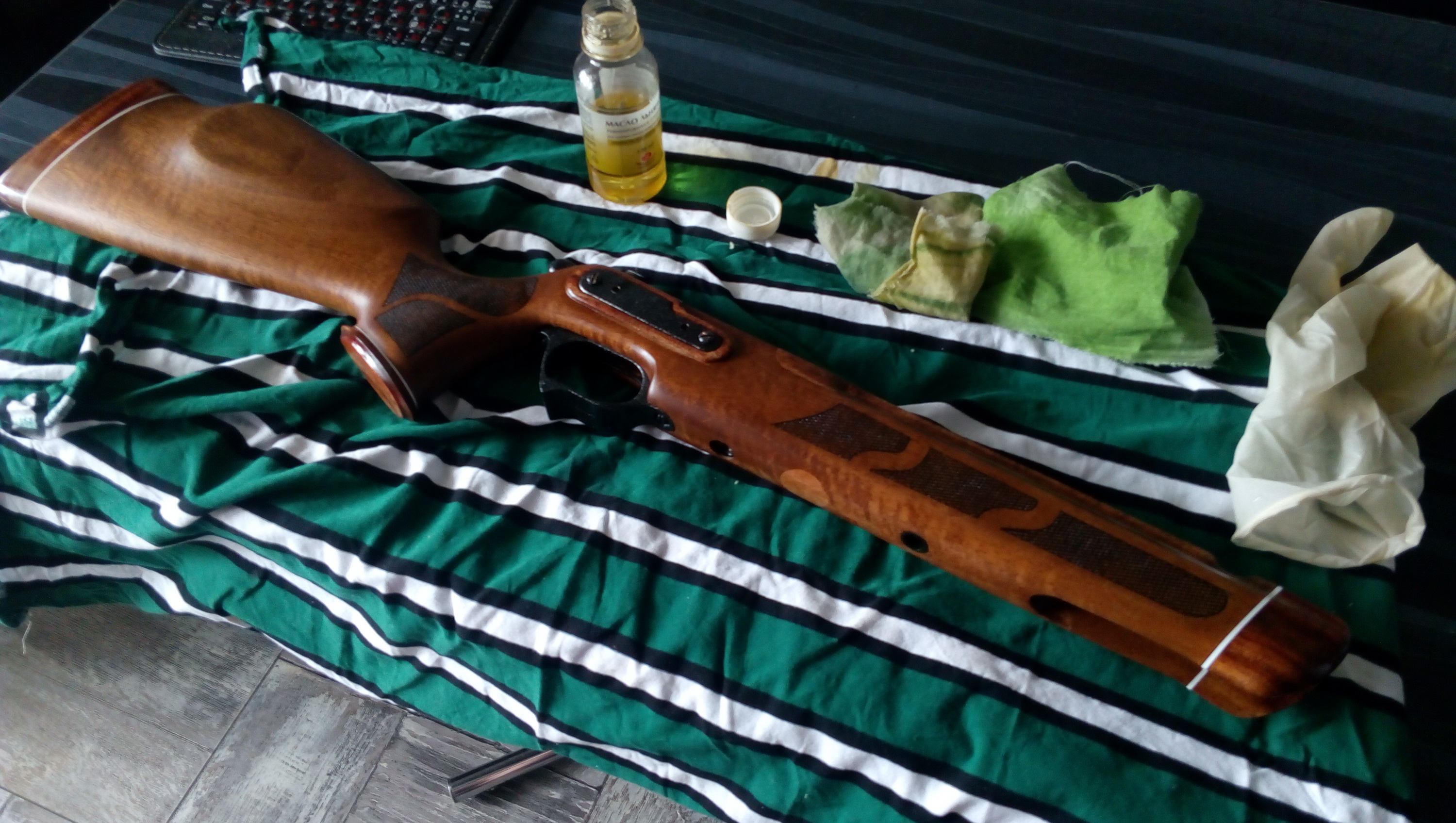 Далее начал пропитку датским маслом Дэниш Ойл. Рассказывать о процессе не буду дабы не тратить ваше время. Про это рассказывал не раз. Ну и всего нанёс 4 слоя датского масла. Последний слой высушил основательно и натёр ложу обычной мягкой тряпочкой для вам показать: