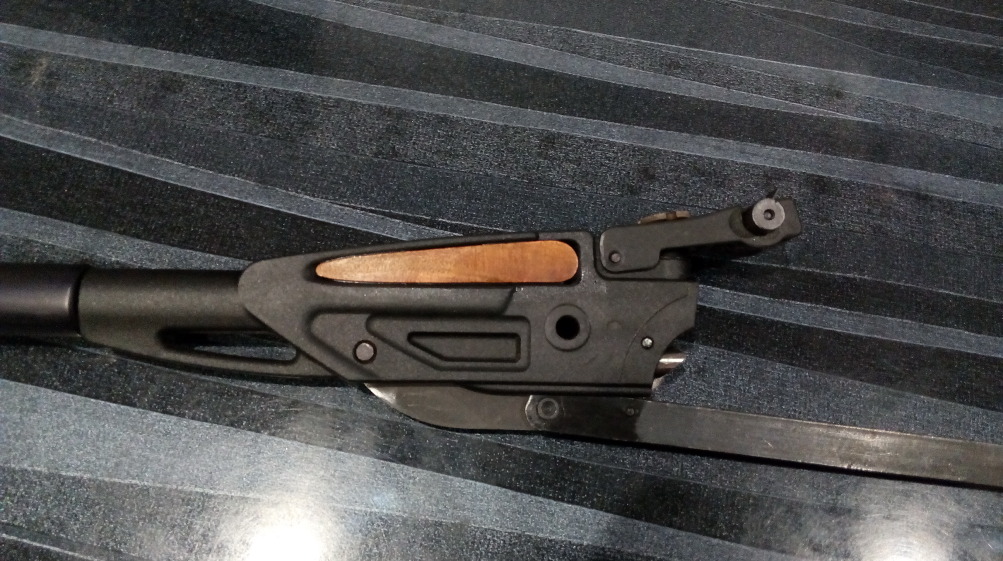 Вот теперь можно было доработать выборку. Необходимо было распилить правильно нос цевья для посадки муфты(казны) в нём. Это делал настолько аккуратно- ну не хотелось лишних доработок потом и т.д. В итоге всё вышло отлично. Между казной и стенками в цевье с обоих сторон буквально 1,5-2мм зазорчик. Также как и планировал изначально доработал заднюю втулочку под крепёж «Мурки» снизу, впереди выкрутил родную втулку, доработал её под винт под шестигранник и просверлив новое отверстие под крепёж впереди, вклеил её на ЭДП надёжно в ложу. Передний крепёж сделал именно снизу-не хотелось мне в боках ложи сверлить отверстия. Там и насечку пришлось бы покоцать-потому в передней опоре сделал резьбовое отверстие М5 именно снизу. Его сверлил после того как вставил в ложу «железо», точно отметил его на опоре передней через втулку, просверлил и нарезал потом резьбу указанную. Сделал и два винта крепёжных под шестигранник нужной длины. Вот получившиеся «рога» и врезанные втулки, скоба спусковая. Видна и вклеенная на ЭДП вставка в середине на месте торчавшего там раньше манометра «Крала» :
