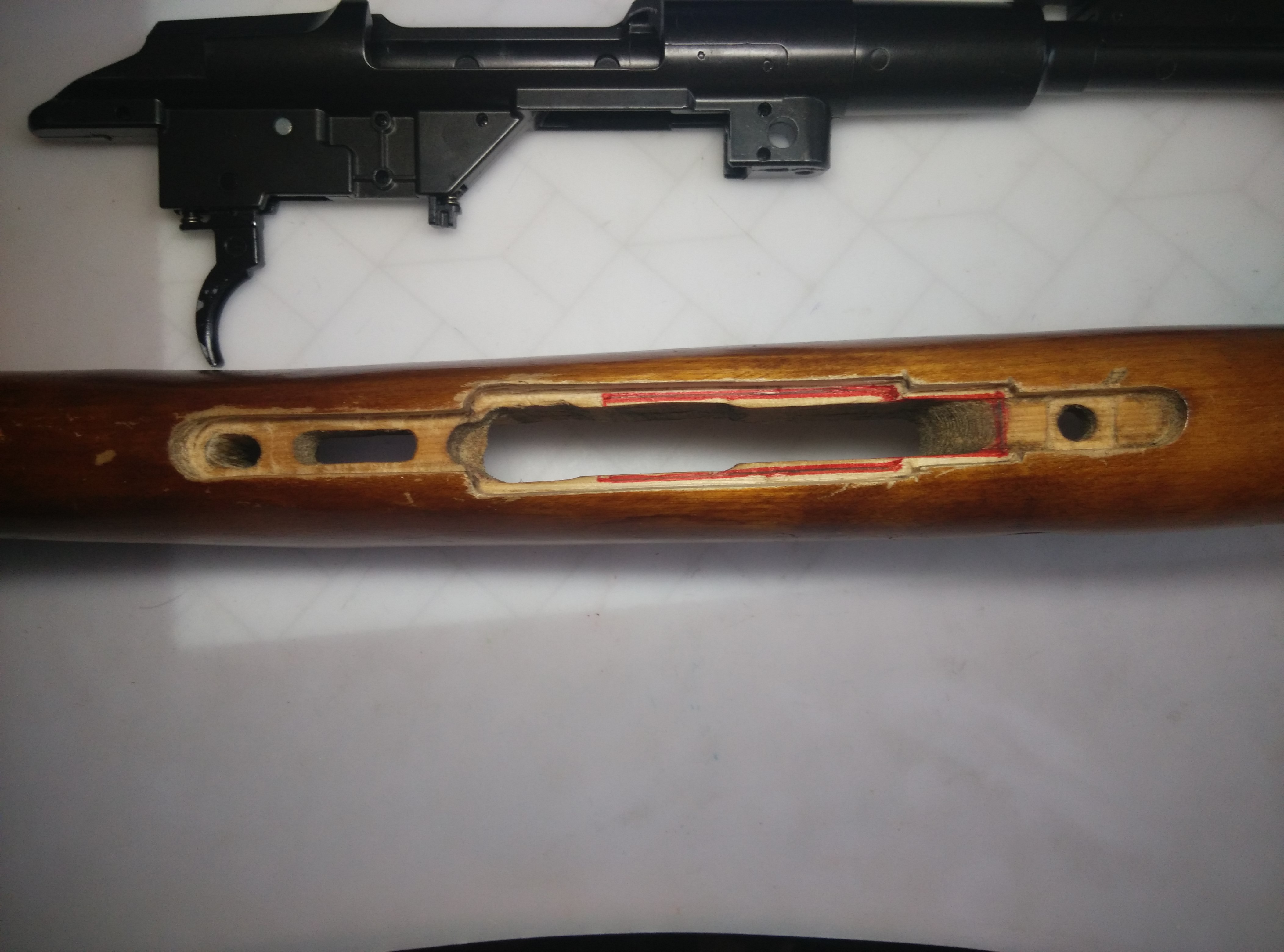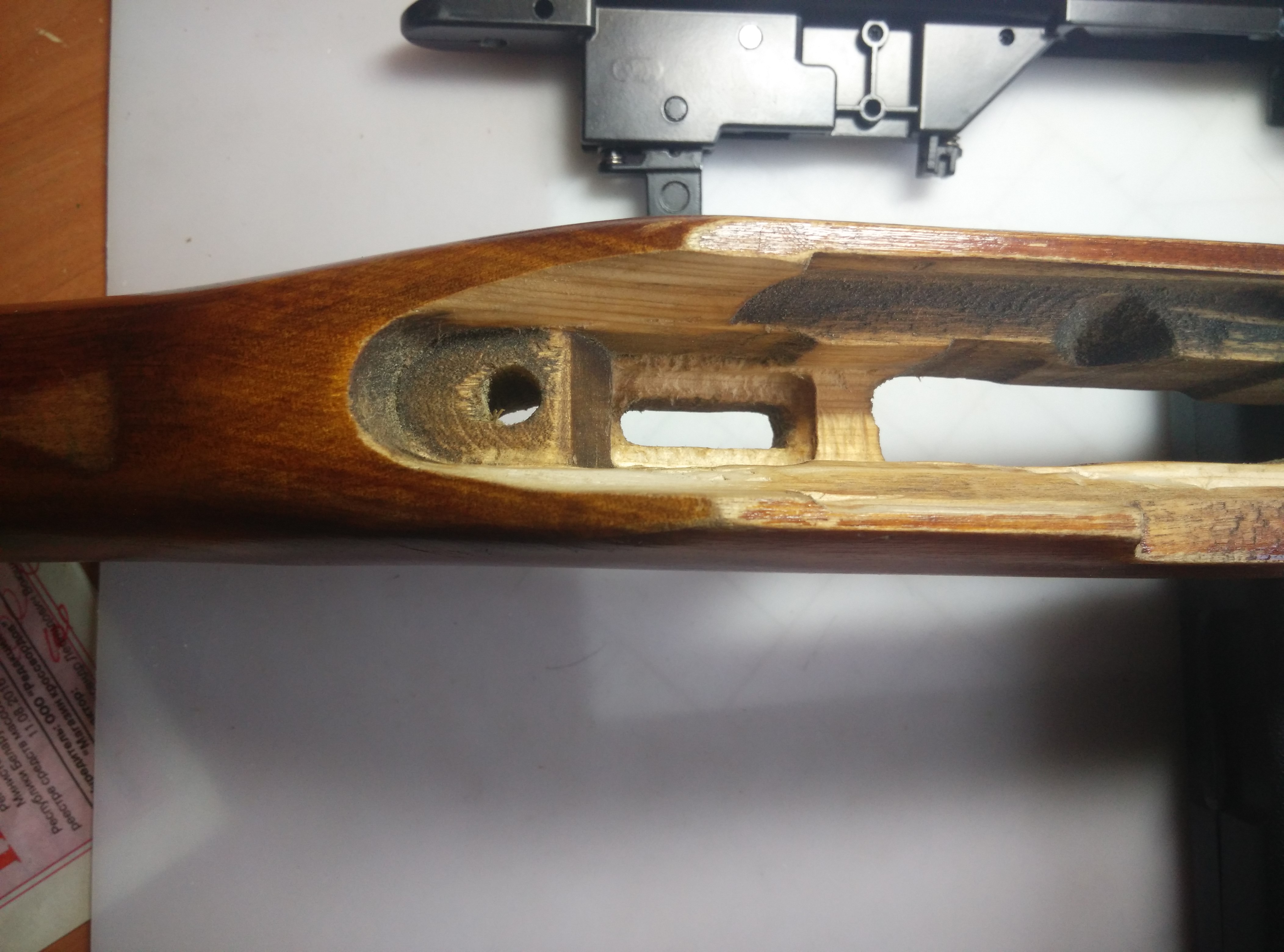 Да! Надо быть очень аккуратным с глубиной выборки под винтами с обеих сторон. Или потом придется что то подкладывать. Магазин будет подклинивать, если какая нибудь не соосность магазинной и ствольной коробок. Я долго не мог полять, почему магазин не отщелкивается, он подпружинен изнутри, пока не нажал на спусковую скобу коробки влево. Он сразу, же выскочил. Подложил зубочистку справа от винта, затянул. Коробка встала на место. Магазин работает. Эти мелочи, после отладки можно будет устранить, вклейкой дерева или холодной сваркой.