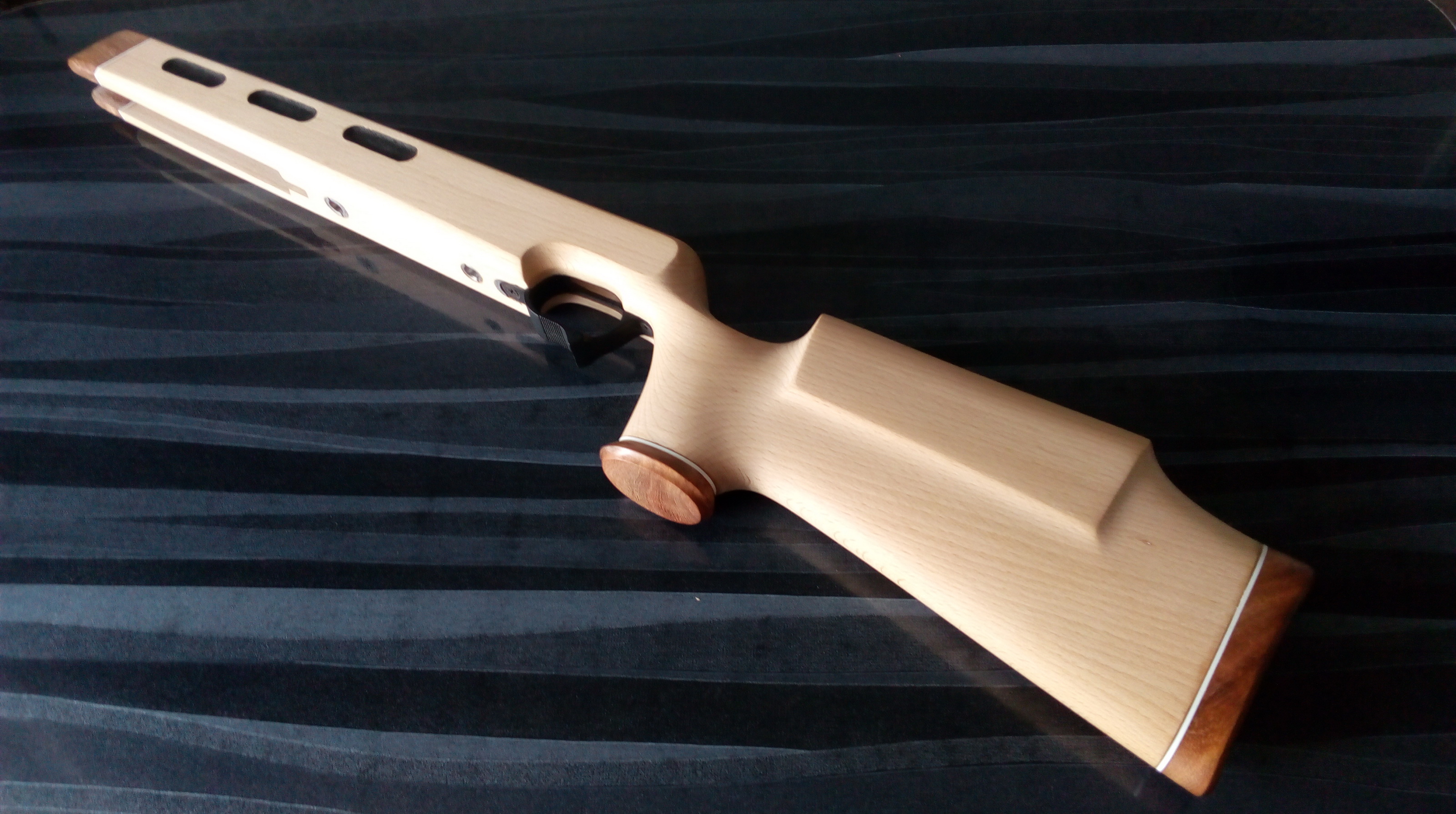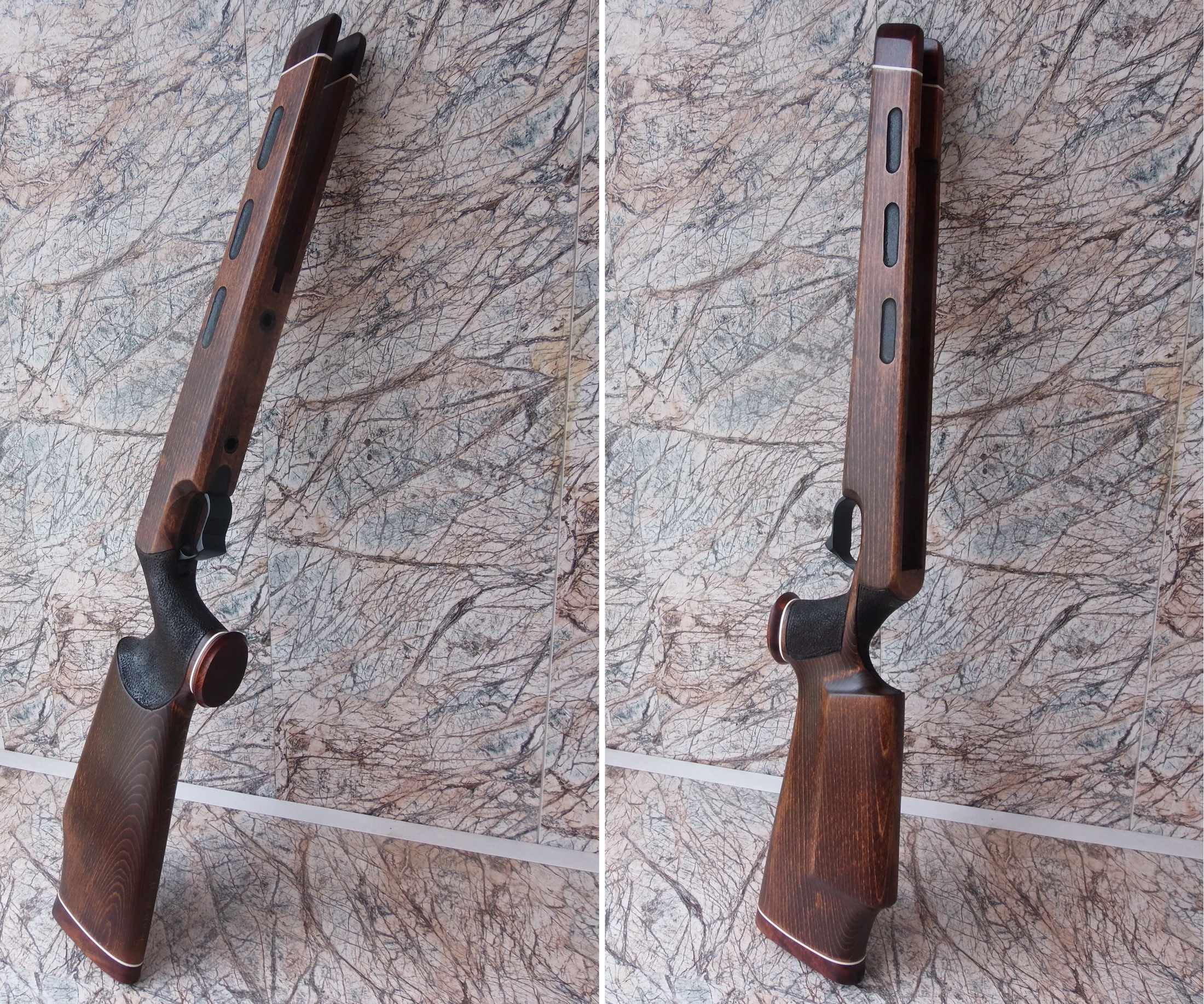 Далее была изготовлена ложа. Хотелось придержаться форм именно Дианы. Исключение составила высота цевья-сделано было чуть меньшей высоты. Это было предусмотрено формой спусковой скобы которую хотел применить. А именно скобы «Зуль-312». Повторю-мне очень нравятся эти скобы и я уже неоднократно применял их на своих работах. Благо дружище Руслан на принтере напечатал мне их в достаточном количестве. После на затыльник была изготовлена белая прокладка из ПВХ пластика, также и на рукоять. Сразу была задумка сделать затыльник винтовки, пятку на рукоять и нос цевья из красивой породы дерева. Вот такая получилась буковая ложа с пластиковыми прокладками и скобой: