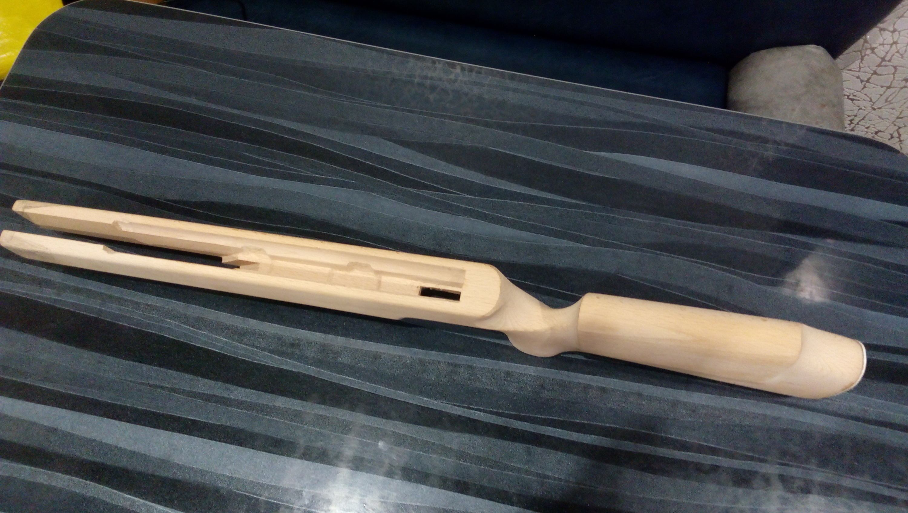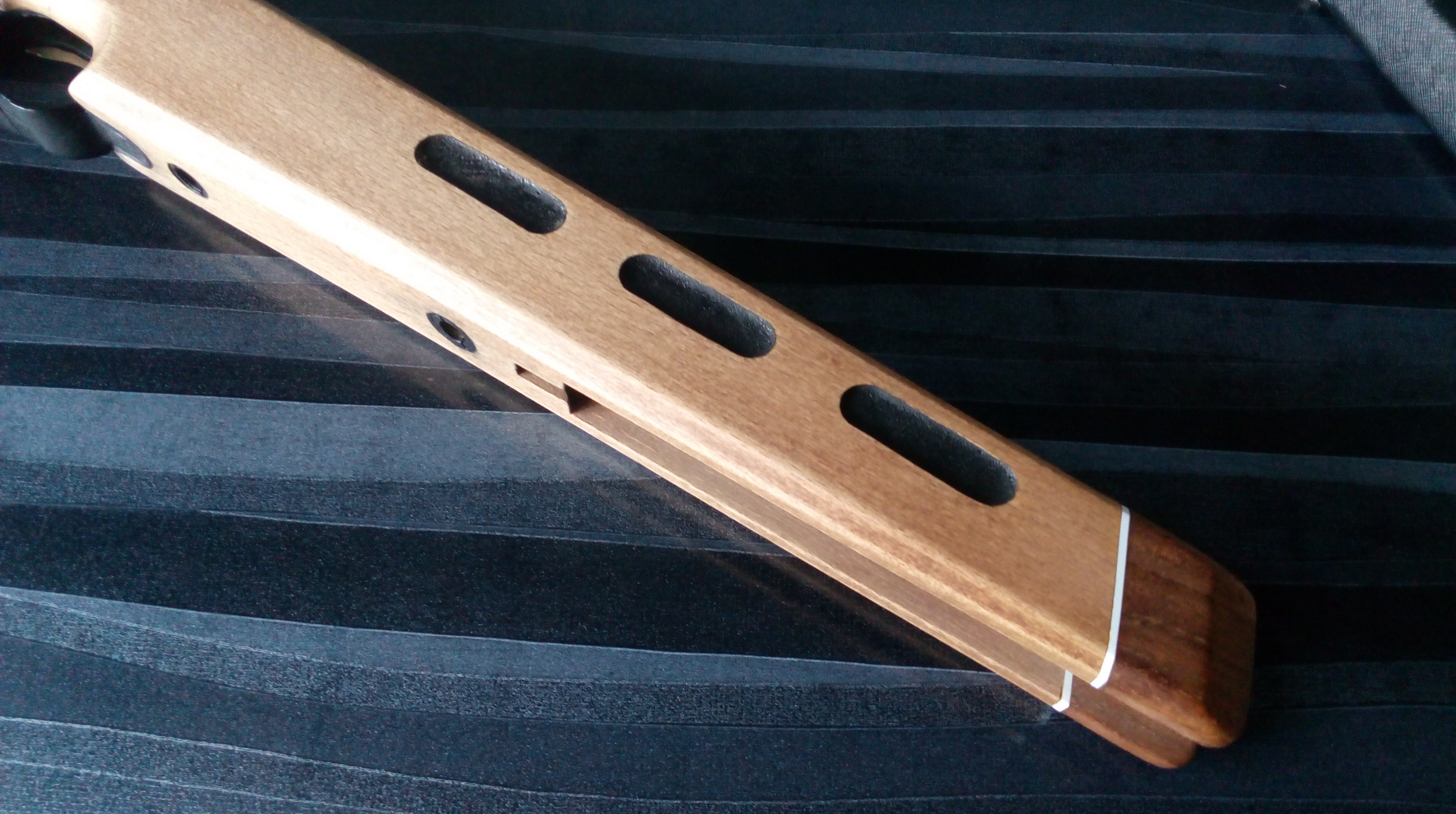 На фото носиков цевья видно как отлично сливается этот декор после зачистки с основной ложей. Позже так были подогнаны остальные элементы. Ну а на тот момент уже вот такой облик приняла буковая ложа с декоративными элементами из экзотической породы. Скоба пока не закреплена:
