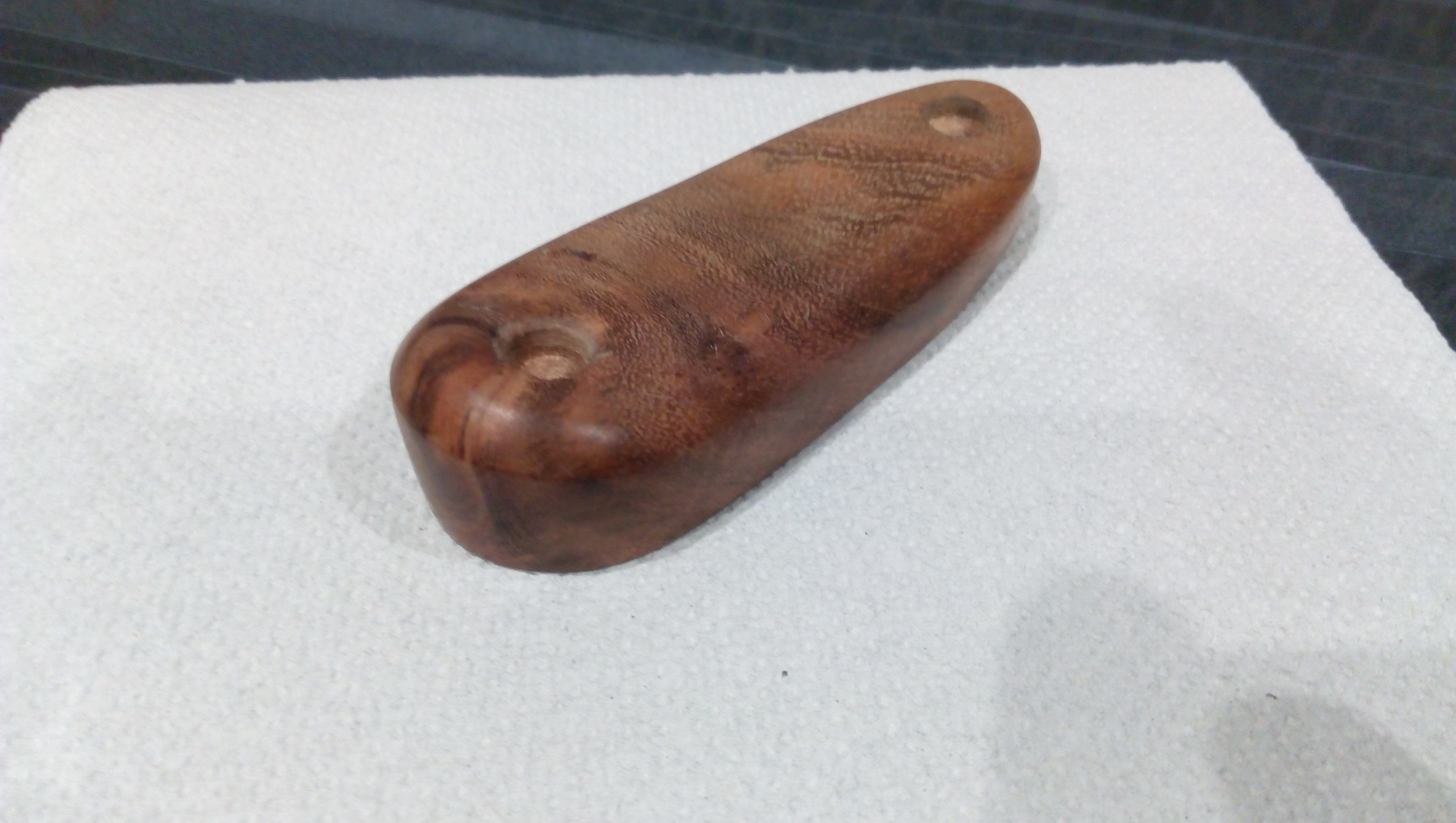 После изготовил те самые декоративные элементы. Из красивой индийской породы сделал затыльник на приклад, пятку на рукоять и носики на цевьё. Порода очень красива и обещала после пропитки маслами порадовать красотой ещё больше: