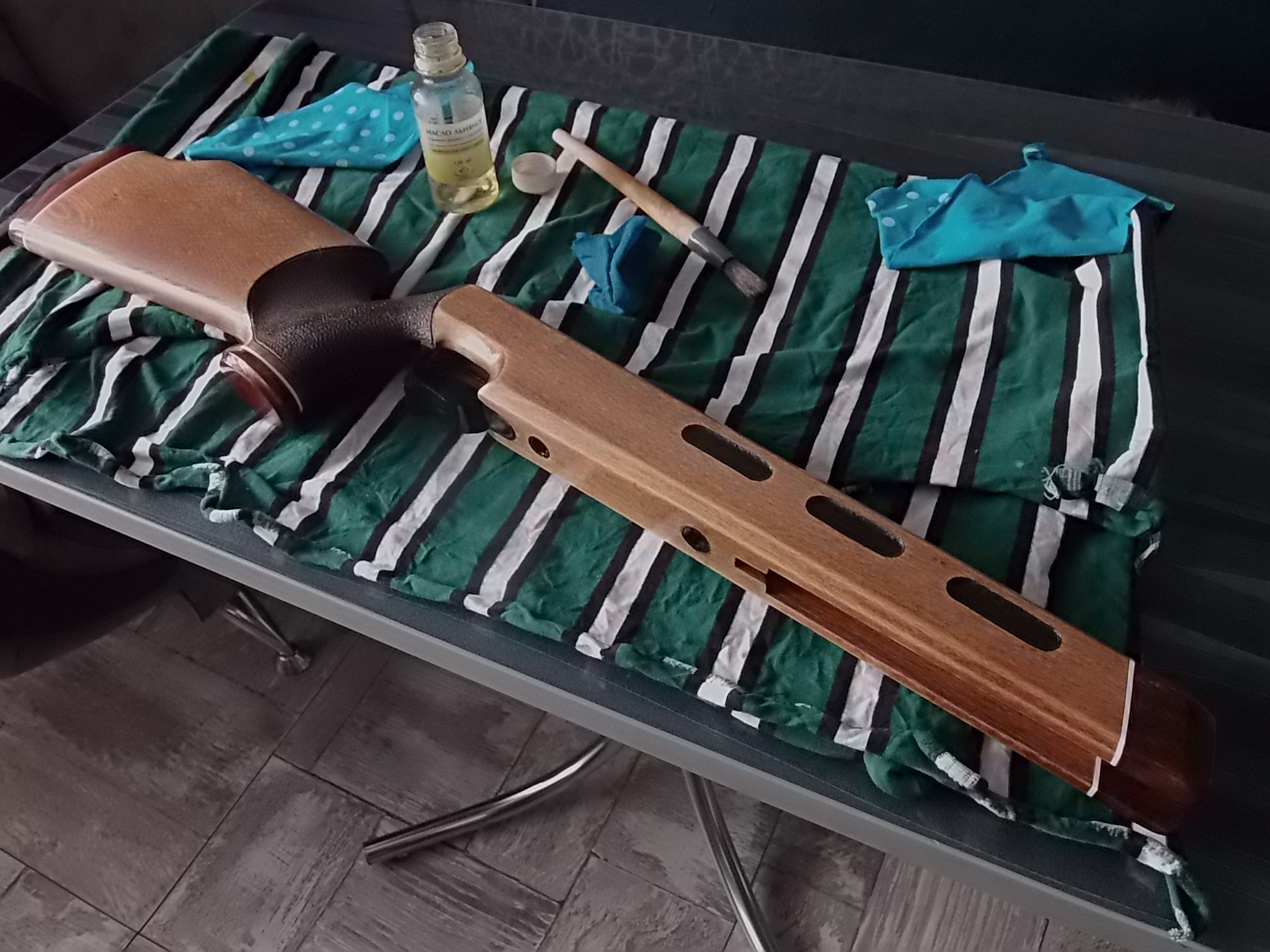 А ещё очень мне хотелось сделать справа на прикладе какую-либо лазерную гравировку. Как примеру мы делали «Орлана» на ложе под «Зуль-312». Но….Обещания помочь мне в этом вопросе лишь остались обещаниями. Потому из этой затеи ничего не вышло… Но признаться позже я осознал-той самой «татуировки» после пропитки пожалуй и видно не было бы. Как всегда говорят- «Чем проще-тем лучше»!!! Ну а так как всё было готово к пропитке-к ней и приступил. На старте применил льняное отбеленное масло. Для нанесения на гладкие поверхности применял тряпочку, а там где пористые участки-втирал масло кисточкой. Это чтобы возможные ворсинки с тряпочки не сыпались в эту пористость. В общем за один подход втёр я в ложу практически весь флакончик масла. Обтёр немного погодя ложу насухо и отправил на основательную сушку в подвешенном состоянии в тёмной кладовке. А начало перед вами: