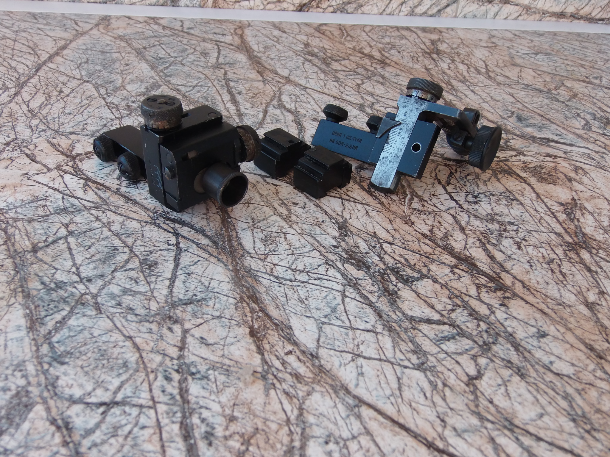 Для стрельбы можно использовать родной целик «МР-512». Но «закос» то был под спортивную «Диану»? Потому для этого нужен был диоптр-чтобы полностью внести в изготавливаемое нотки спортивной винтовки. Для этого достал из хранилища давно подаренный дружком Саней диоптрический советский прицел. Он был на боковое крепление. Но в тех же закромах нашёл повышающие планки «ластохвост-ластохвост», а на них кроме верхней «ласточки» по бокам этой планки также были «ласты». Вот так на левую «ласточку» этот диоптр и можно зацепить, а после надёжно закрепить конструкцию на «ласточку» на компрессоре. Выходило очень даже неплохо. Диоптр хоть давний, но работает «как бабушка просила»!!! Щелчки чёткие при введении поправок, ничего не болтается, всё работоспособно на УРА. Вторым вариантом стал диоптрический прицел от советской винтовки «Урал»-он был на стандартный верхний ластохвост. Прикупил его по очень приятной цене на нашей барахолочке. Он был более удобен и не такой громоздкой была конструкция его крепежа на компрессоре в отличии от прицела с боковым креплением с теми переходниками. Вот эти самые диоптры из СССР: