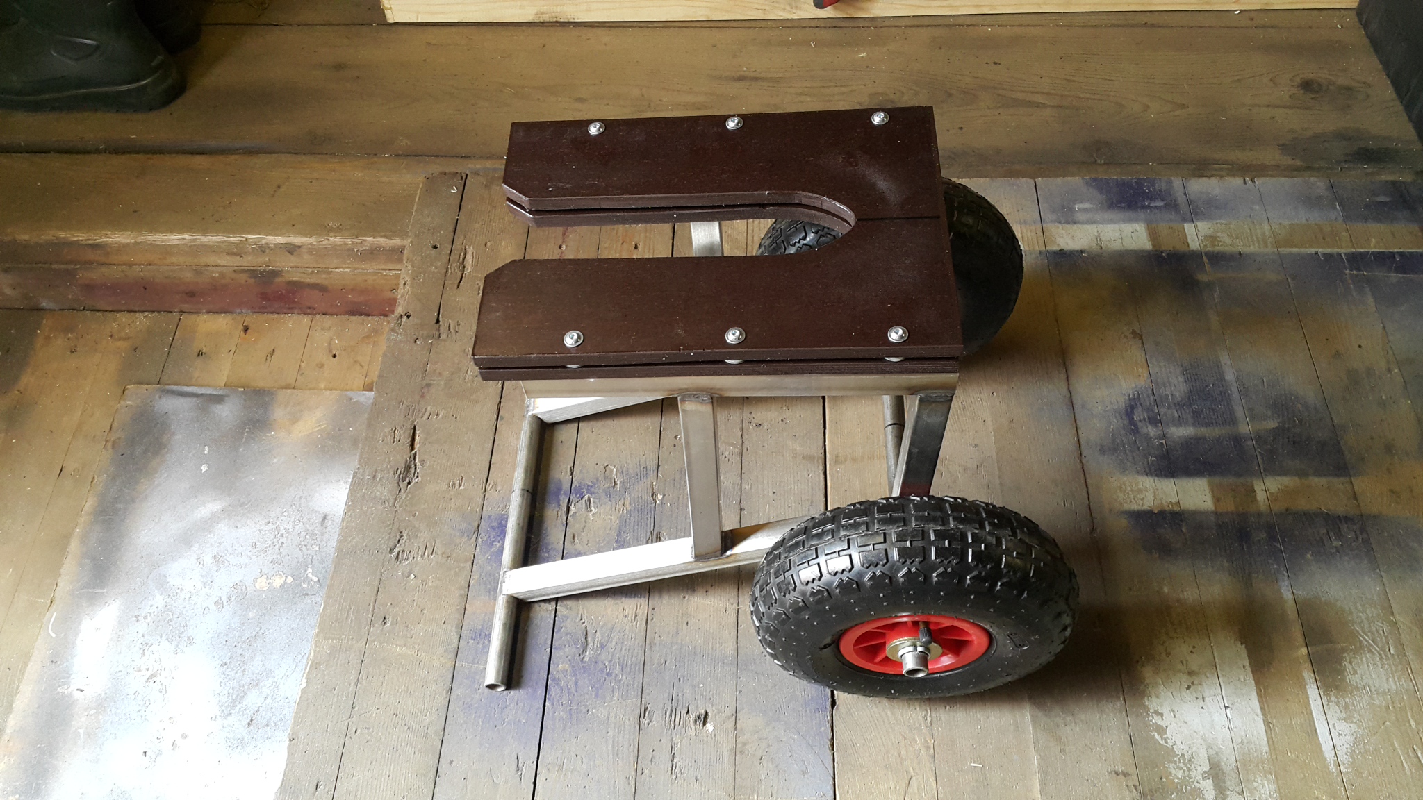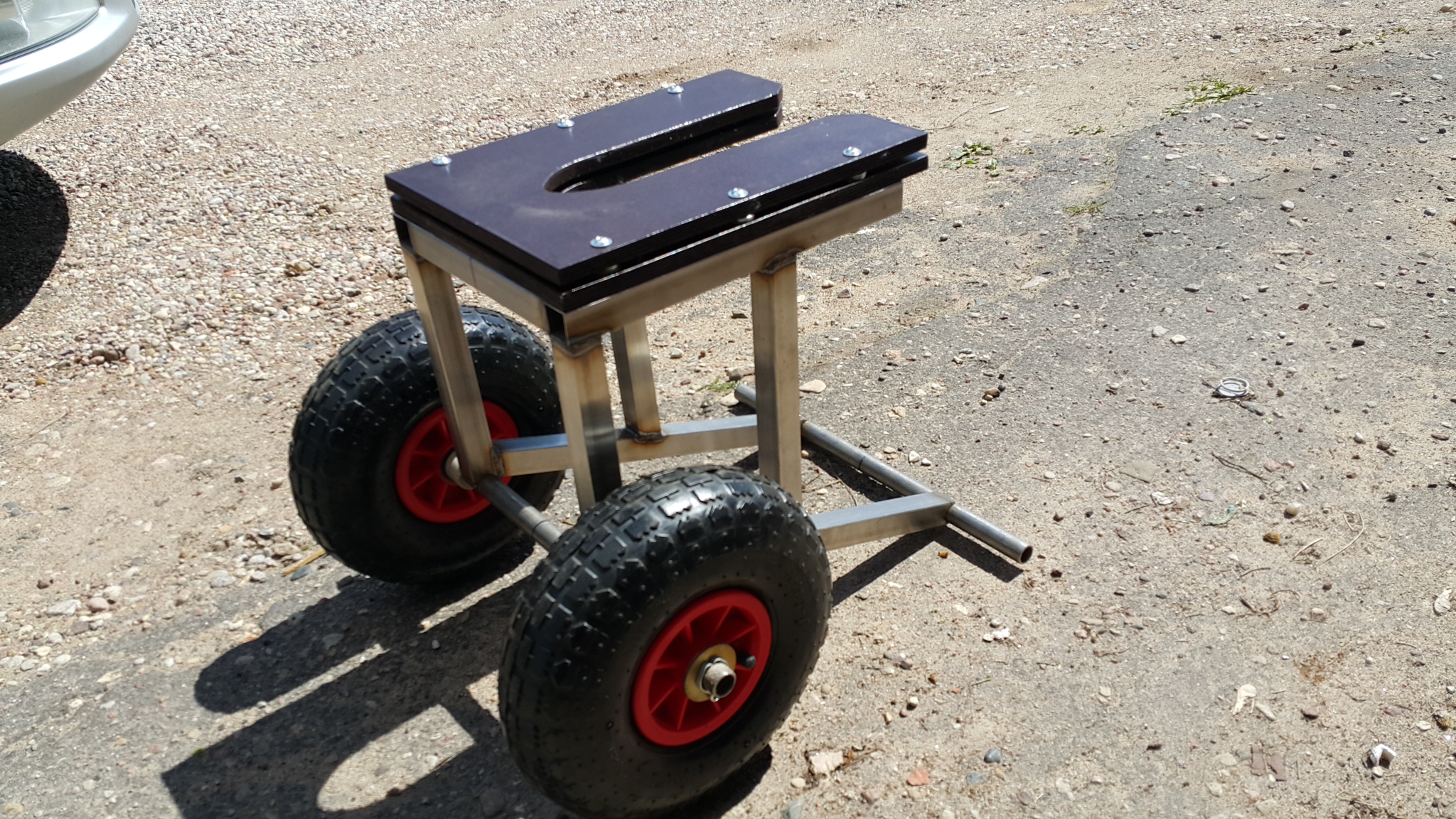 Тележка для лодочного мотора, из нержавейки. Ширина пропила 60мм. Для мотора мощностью от 5 до 30 л.с. Сварена из нержавейки 25*25*1,5, трубка - ось нержа 20мм