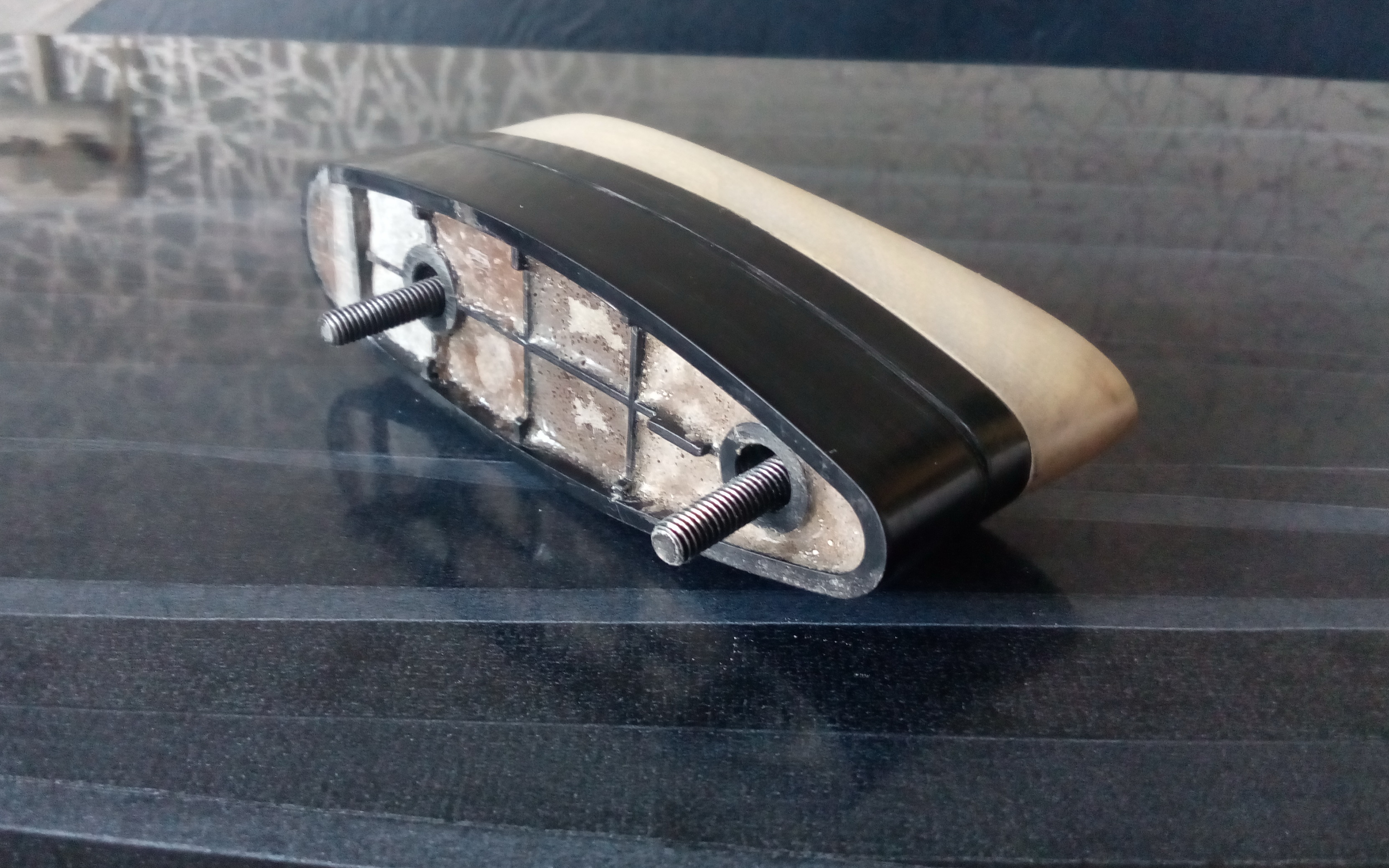 Потом наморщил ум-а допустим сошки сняты и с опоры стрелять не будешь? Остаётся планка голой, а рука левая держит винтовку именно там! Будет планка резать ладонь как здрасьте! А это не есть гуд! Заказчик обидку затаит, порчу какую наведёт)))))))) В общем опять братка Руслан выручил-напечатал мне пару заглушек/накладок на планку. Снял сошки-задвинул на вивер заглушку. Надо сошки-стянул с планки заглушку. Одевается она туго, с одной стороны накладка заглушена. Т.е. со стороны дульного среза. На итоговых фото вы увидите как эта заглушка приживается на планке!!! В общем немножко возьни с наждачками ,грунтование, окраска, маленькие овальные элементы заполнил мелкозернистым антигравием. На фото две накладки/заглушки-одна готовая и полуфабрикат для сравнения.И вид внутри: