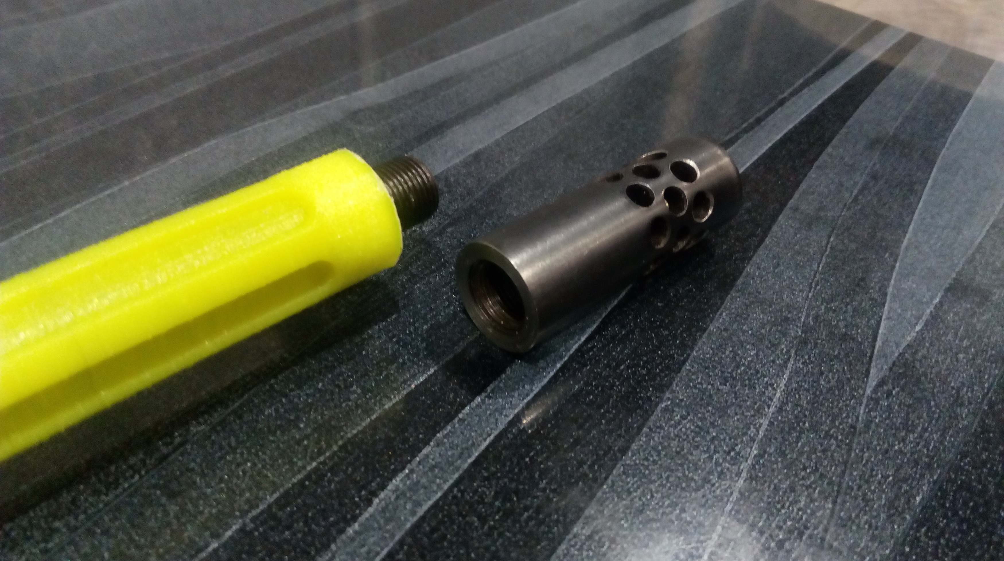 После окрашивания разумеется всё это выглядело по-другому. Ну потом увидите!!! А далее расскажу о фальшстволе с долами. Его после обезжиривания ствола снаружи посадил до упора в муфту ствола на ЭДП. Специально для этого проекта в качестве бонуса заказчику изготовлен был шикарный дульный тормоз. Длина фальшствола была расчитана так, чтобы резьба на стволе оставалась для его крепления. Ну и вот так на тот момент всё получалось: