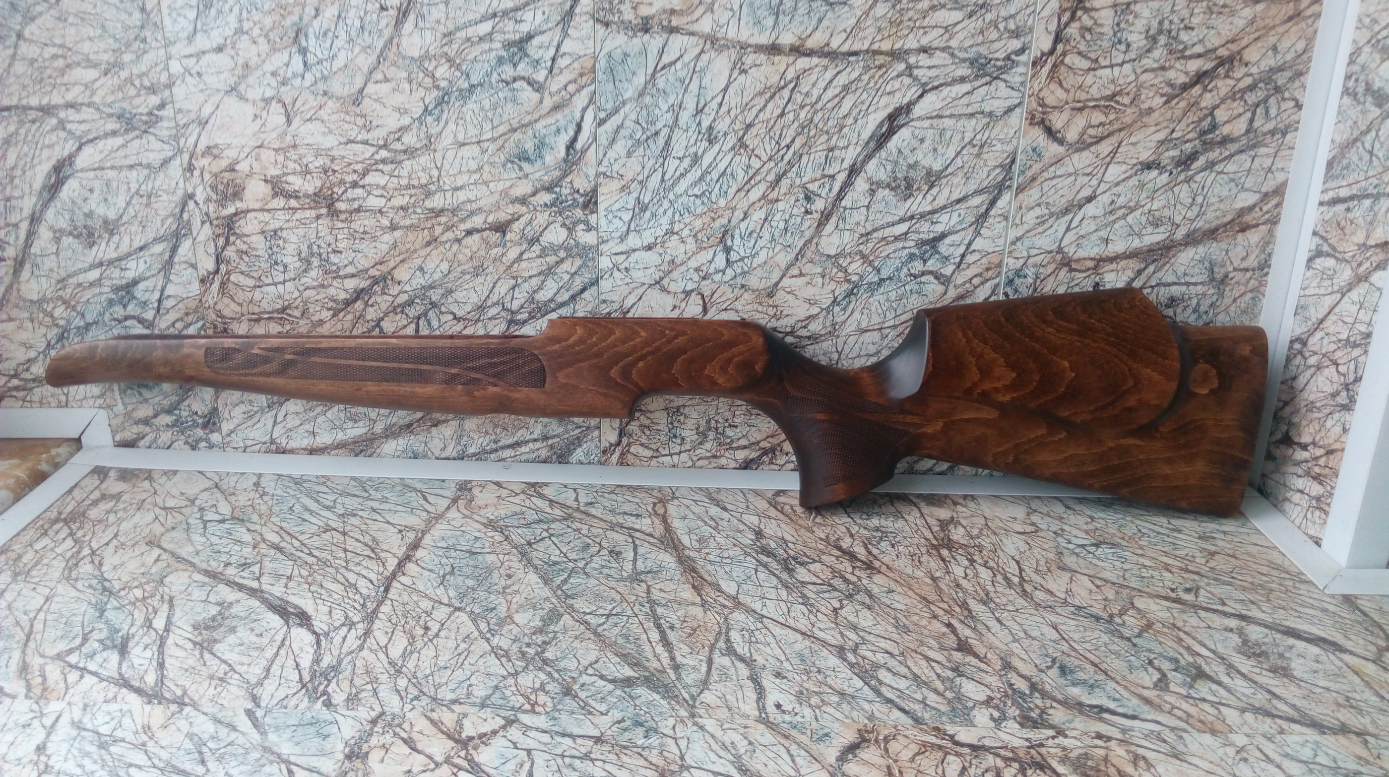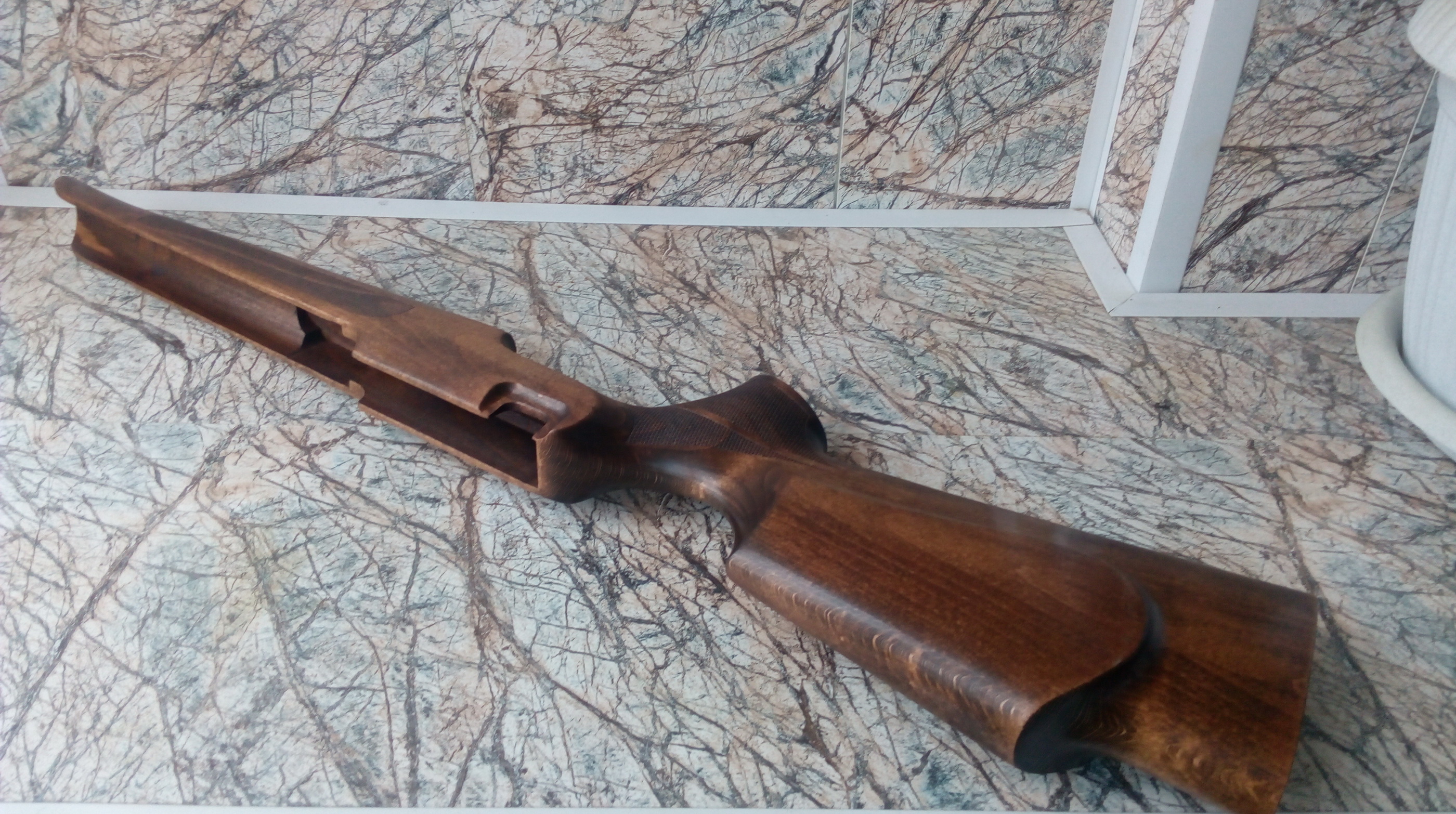 Прежде всего окрасил ложу морилкой водной "Дуб",добавив немного "Палисандра". Владельцу как и мне нравятся ложи более класического цвета. Окрашивал с помощью тряпочки-т.е. ложу натирал смоченной в морилке и хорошенько отжатой тряпкой. Сделал два подхода,не ожидая полного высыхания,взял чистую мягкую тряпочку и смочив в гор.воде,хорошенько отжав,растёр нанесённую морилку. Это помогает удалить лишнюю морилку,разводы,открыть лучше текстуру дерева тем самым и сделать цвет более равномерным. После по высохшей ложе прошёлся "Миркой" с зерном 2000-2200. Дерево стало едва ли не зеркальным. Вот таким: Теперь можно было приступить к пропитке. Применялось масло льняное отбеленное в этих целях. Натёр несколько раз ложу-дерево охотно питало масло,потому не жалел его. Немного дал в подвешенном состоянии деревяшке напитаться маслом. И после растёр ложу мягкой тряпочкой,отправил на трёхдневную сушку в подвешенном состоянии в тёмной кладовке. Вот высохший первый слой: Как видите текстура стала уже более отчётливой в сравнении после нанесённой морилки. С периодичностью в сутки нанёс ещё два слоя. Третий в принципе можно было и делать,но сделал. В итоге уже такой оттенок приобрела ложа: Далее пришло время Дэниш Ойл. Был остаток как раз на одну ложу-цвет неопределённый,смесь масел Дэниш. Там и светлый и тёмный орех+чёрного ореха немного. Наносится равномерно растирая на 30 минут,затем той же тряпочкой чуть оживляется нанесённое масло. Оставляем на 15 минут ещё и после чистой мягкой тряпочкой хорошенько растирается деревяха. Надо убрать все подтёки,разводы,оставленные пальцы обязательно! Т.е. практически насухо растереть ложу необходимо! Первый слой нужно также посушить пару-тройку дней. Так первый слой Дэниш Ойл сработает на манер грунтовки-закристализуется в порах и последующие слои постепенно будут приносить полуглянец. Вот после первого слоя Дэниш ложа: Как видите текстура после этого масла стала ещё красивее и выразительнее. Было сделано ещё 3 прохода-по одному в сутки. Технология такая же как и с первым слоем.Последний слой нужно основательно высушить не менее 4-х дней! И после этого вот такой оттенок имела ложа "Крала": А теперь шерстяной старый шарф и хорошенько необходимо натереть пропитанную ложу. Ну чтобы добиться приятного бликования. Ну конечно! Не должна быть ружейная ложа как скрипка Страдивари. Но какую-то элегантность должна и она иметь. Верно? Ну и вот-покрасивше стала палочка: Ну и в таком вот виде ложа была отправлена владельцу на дополнительную полировку и окончательную сборку. В общем и целом думаю он остался доволен итогом,лично мне итог понравился. Особенно когда увидел "Крал" в сборе. Вот собственно и финальные фото-дома и на свежем воздухе. Красиво мне кажется и практично: