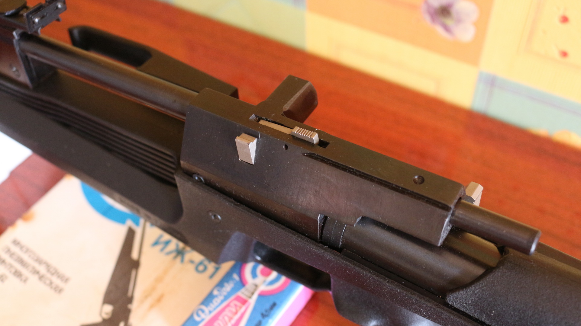 В этой модели ИЖ 61 Всё Металическое - коробка, ручка рычага взвода, магазин для пулек и др.