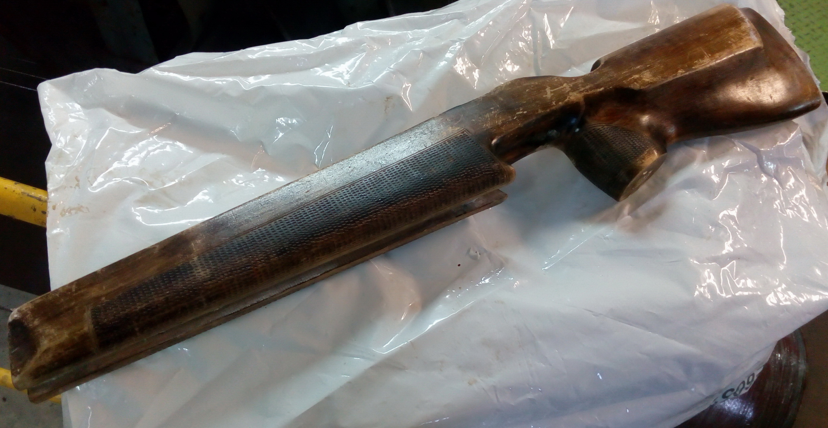 Итак… Появился ИЖ, купил на барахолке весьма интересную старенькую ложу от малокалиберной советской винтовки «Урал 6-1». Требовала она конечно работы немалой, в итоге потрудился я над её доработкой основательно. Оно того стоило-хотелось по-настоящему эксклюзивного, не похожую ни на одну «ИЖ-38». Вот от такой винтовочки была приобретена ложа из берёзы: