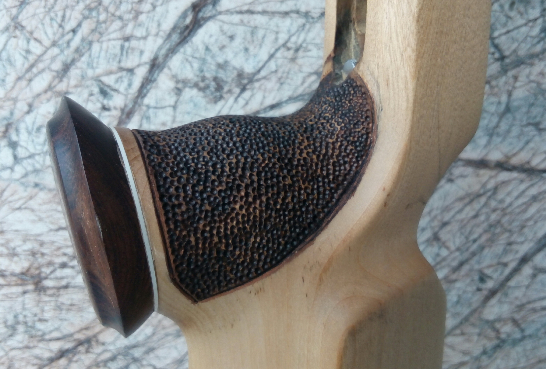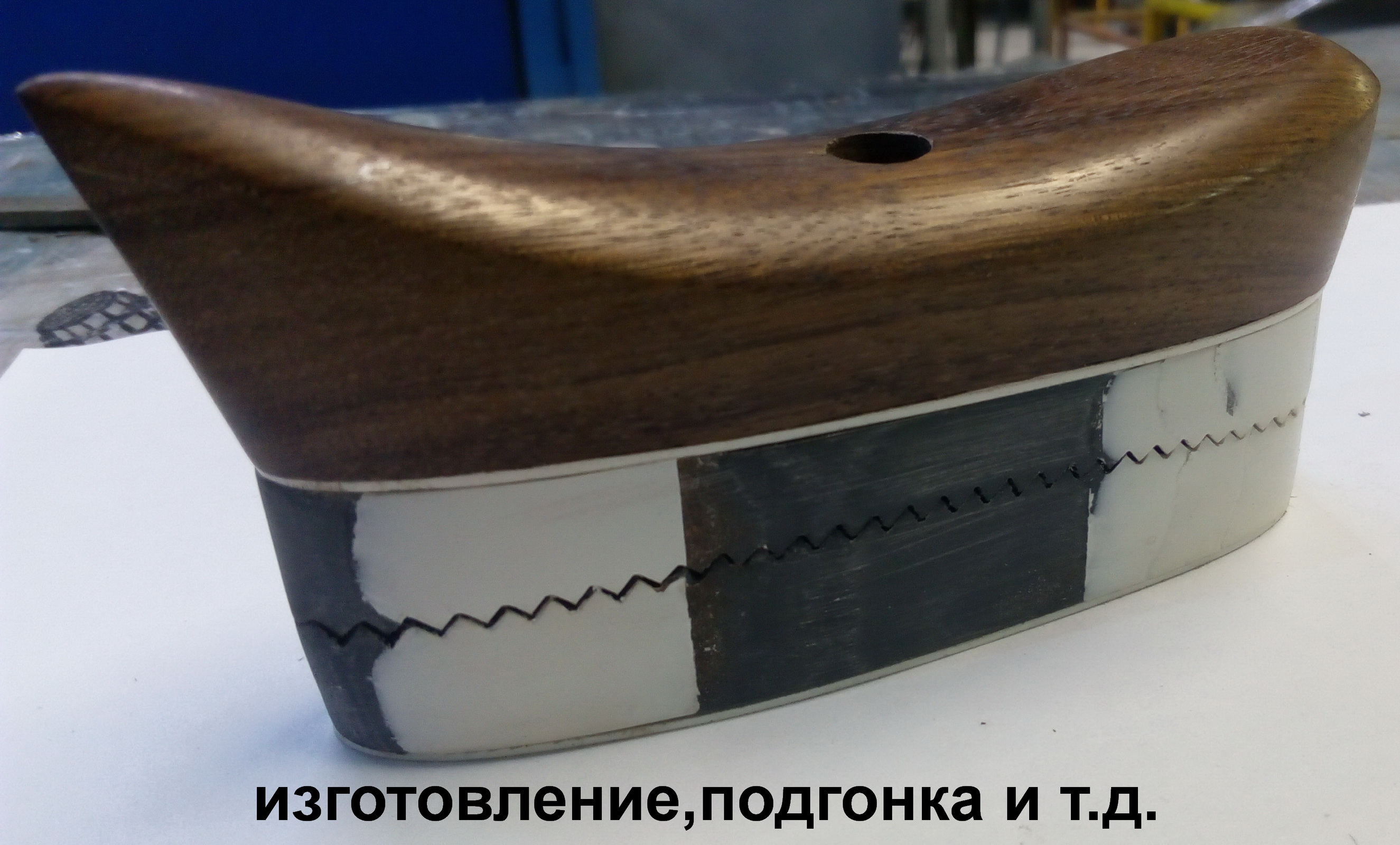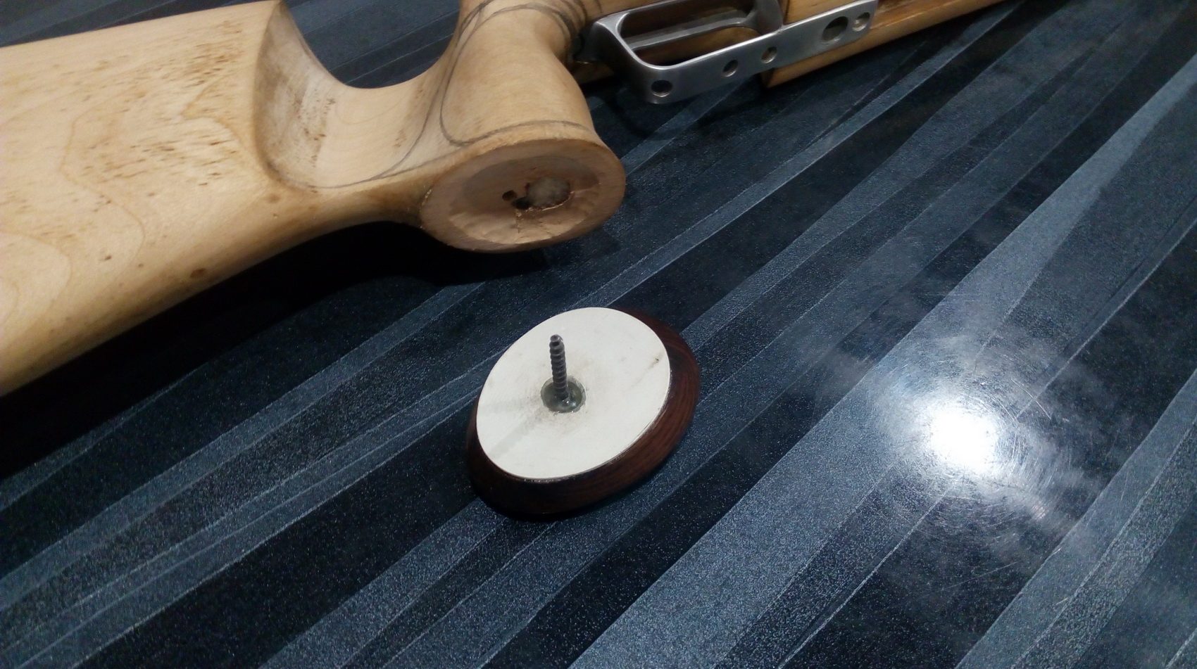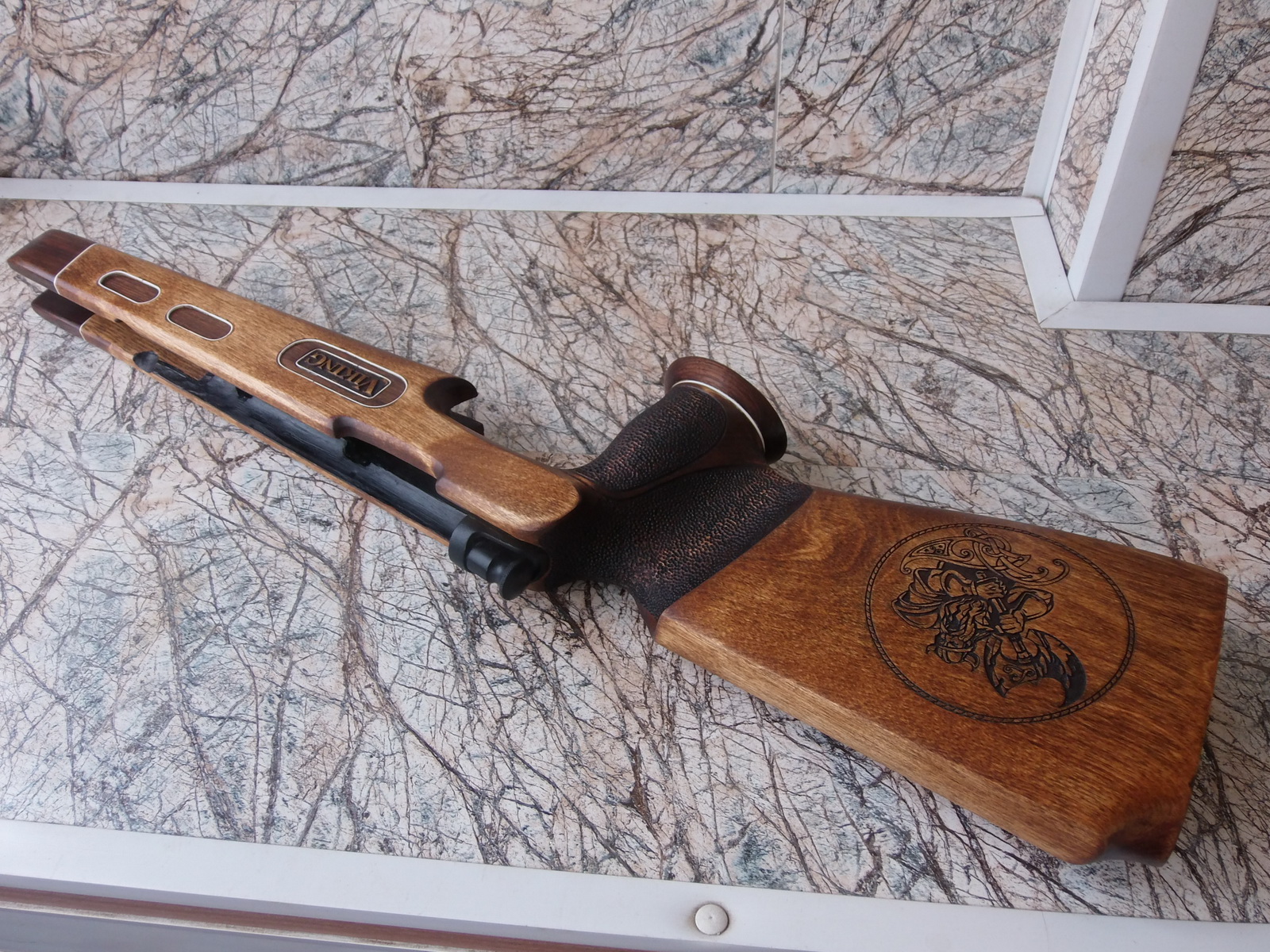 Крайне неудобной лично для меня была и рукоять. Для моей «лапы» с колбасообразными пальцами она была крайне непригодной для хвата. Был и большой плюс-рукоять была отведена вправо как положено спортивной. Как таковой хват был правильным. Но объём рукояти я всё же уменьшил и решил для увеличения длины рукояти оснастить её пяткой из той же декоративной породы древесины. И для декора и для удобства. Предварительно врезал на ЭДП в рукоять стальную шпильку на всю длину-есть оказывается «болезнь» этих лож, а именно отламывается по волокнам или просто даёт трещину порой рукоять. Теперь это было исключено. Пятку закрепил как обычно на шпильку/саморез+ЭДП. Карандашиком пофантазировал какая будет новая наколотка. Вот пару картинок: