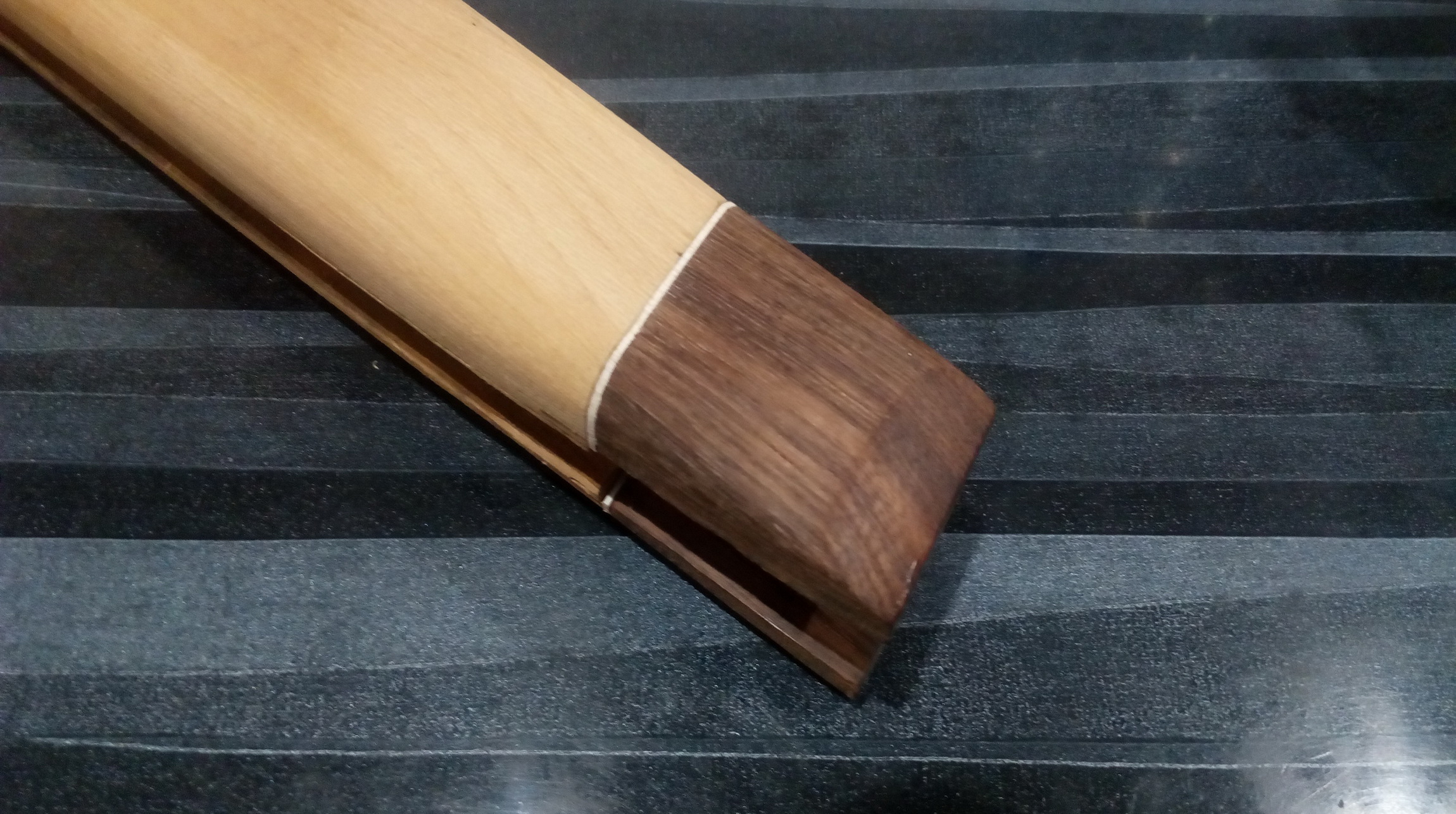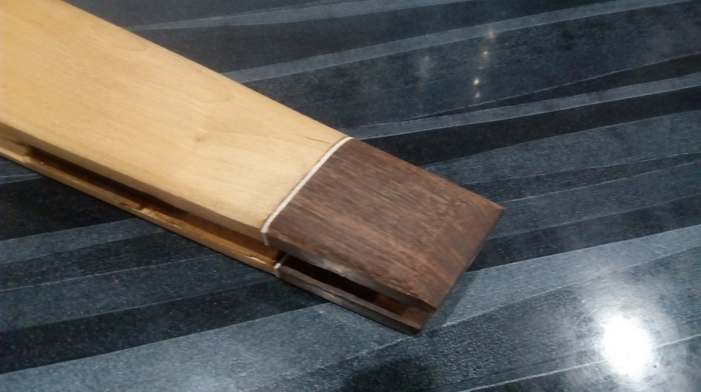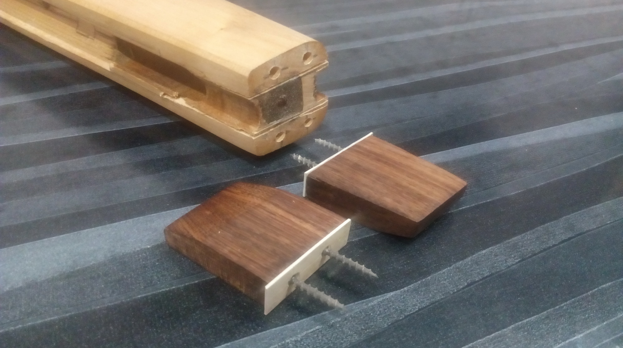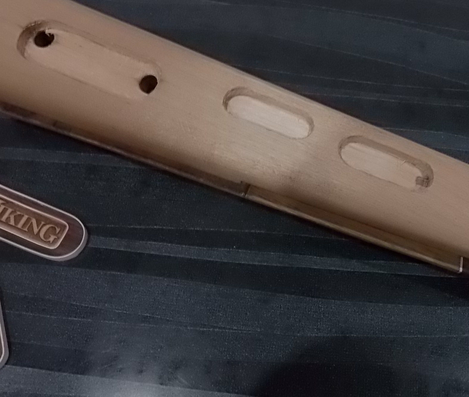 Передок цевья решено было облагородить носиками из той же породы+прокладки. Отпилил некоторый излишек от цевья и закрепил новые носики на саморезы/шпильки +ЭДП. Подготовка и итог после некоторой зачистки: