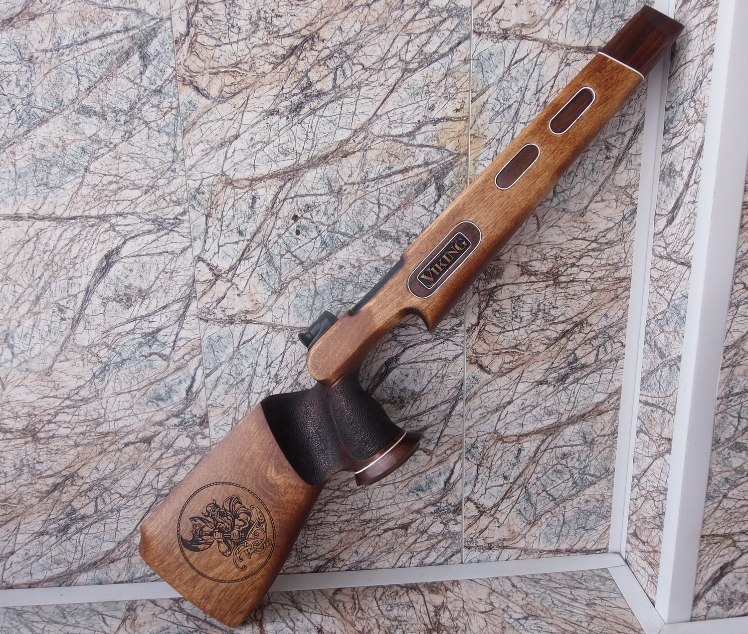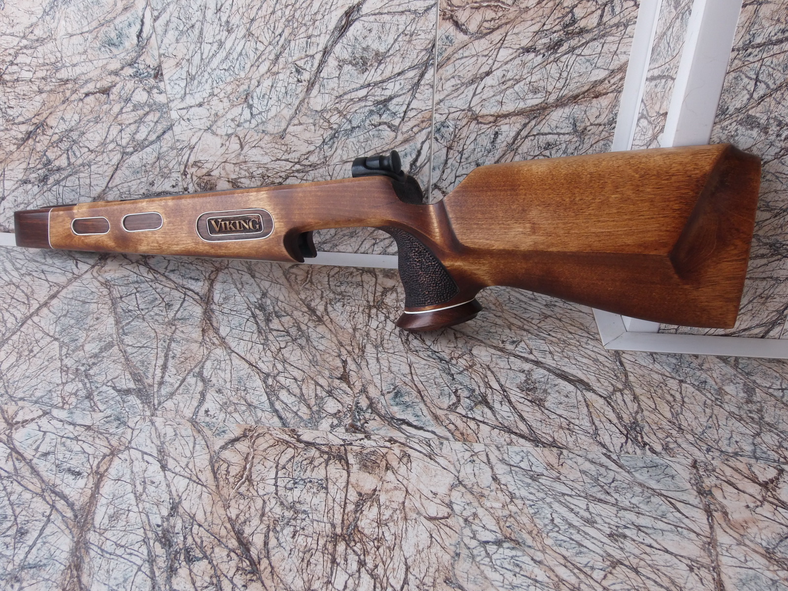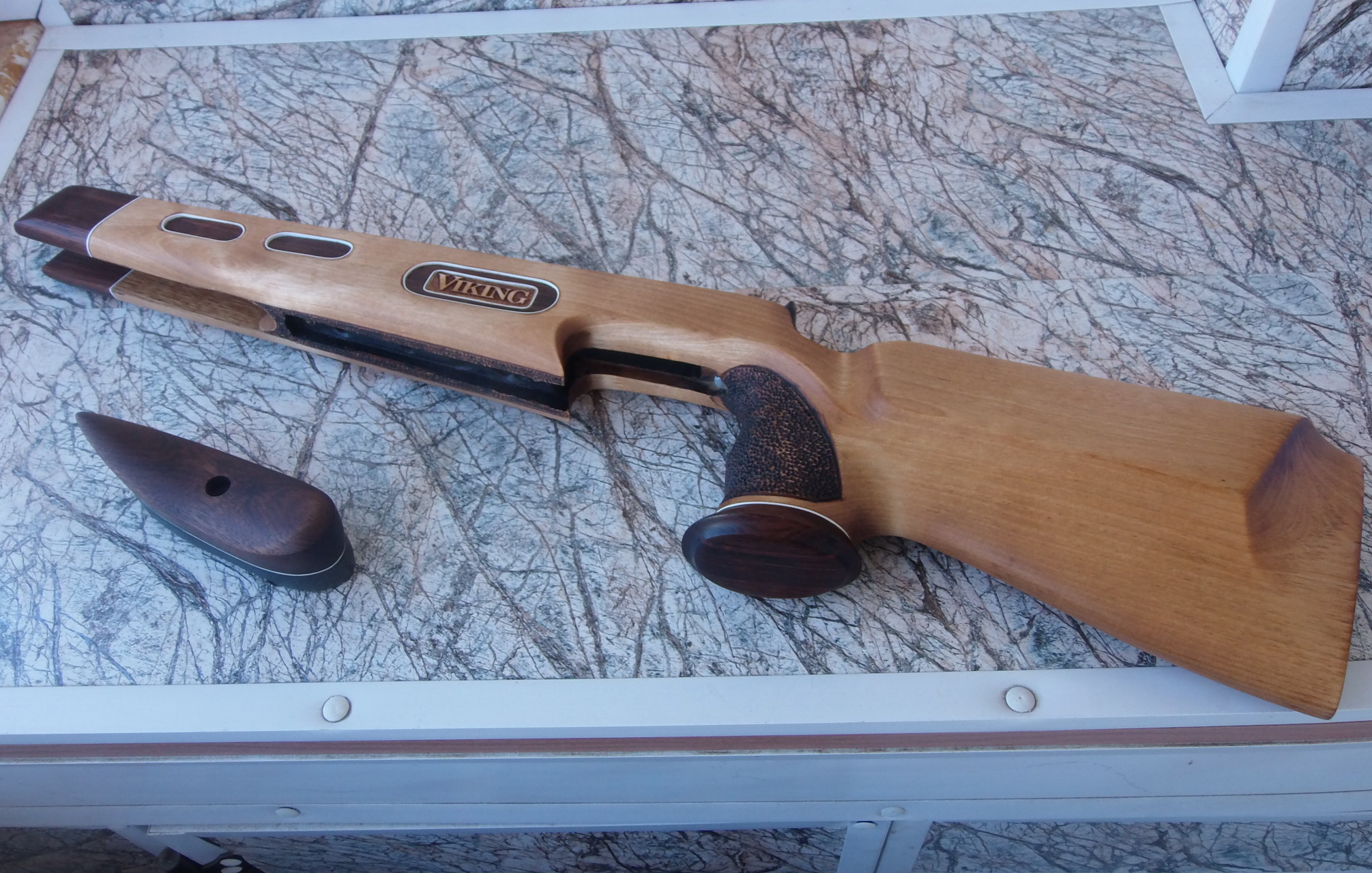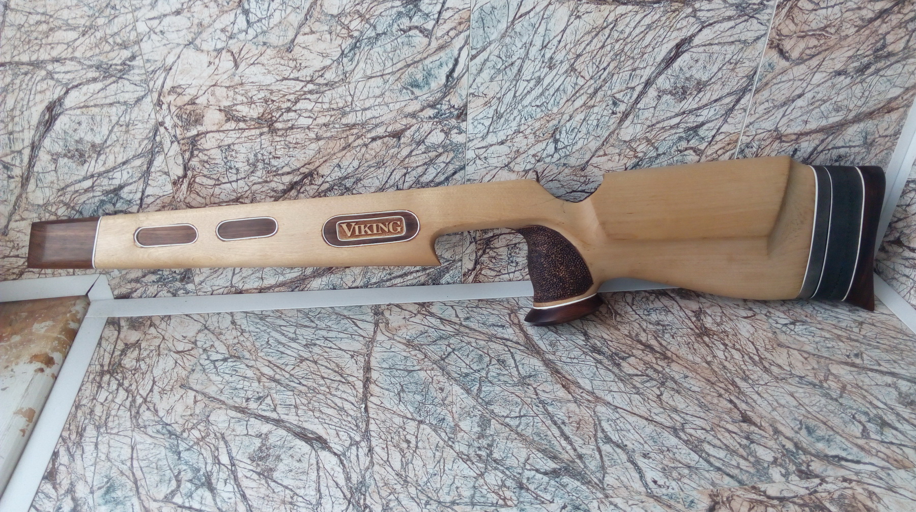 Лично мне получившийся оттенок ложи пришёлся по душе-классика есть классика. Древесина для декорирования применённая получила именно те оттенки после масла что и планировались. Как по мне-весьма интересно гармонируют элементы из этой породы с берёзовой ложей. Ну а сделанная лазером «татуировка» не броско, а довольно скромно но в тоже время стильно прижилась на прикладе. Не как бельмо на глазу, а просто добавлением каким-то в общей картине.Вклеенные из дубового шпона вставки само собой также обрабатывались маслом. Ну и по накатанной технологии пробуем собрать «Викинга». Сначала фото будут с диоптром, установленным на планку ластохвост на компрессоре: