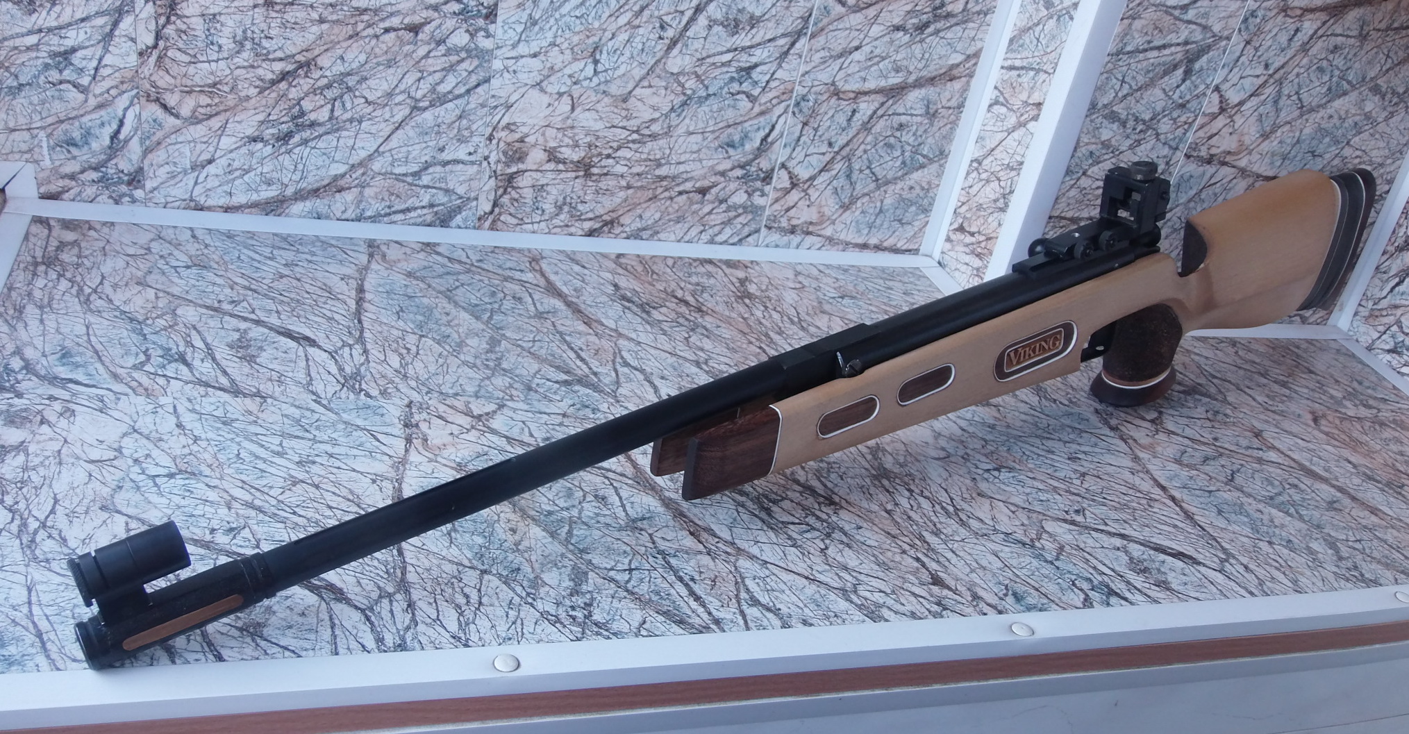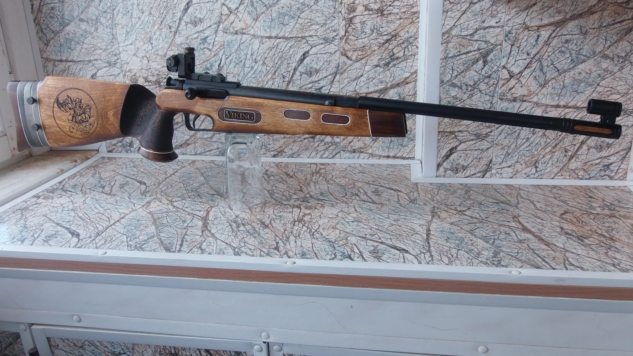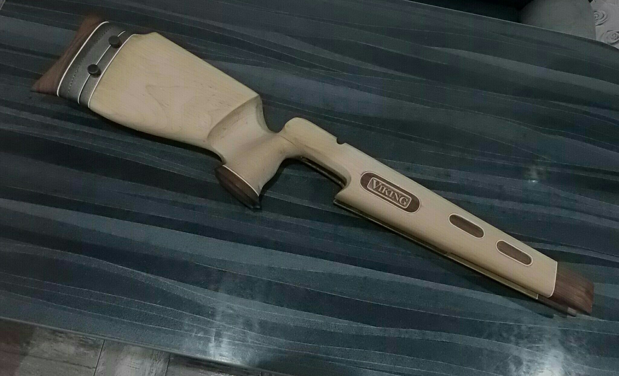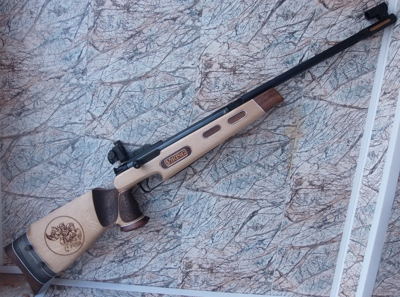 Лично мне получившийся оттенок ложи пришёлся по душе-классика есть классика. Древесина для декорирования применённая получила именно те оттенки после масла что и планировались. Как по мне-весьма интересно гармонируют элементы из этой породы с берёзовой ложей. Ну а сделанная лазером «татуировка» не броско, а довольно скромно но в тоже время стильно прижилась на прикладе. Не как бельмо на глазу, а просто добавлением каким-то в общей картине.Вклеенные из дубового шпона вставки само собой также обрабатывались маслом. Ну и по накатанной технологии пробуем собрать «Викинга». Сначала фото будут с диоптром, установленным на планку ластохвост на компрессоре: